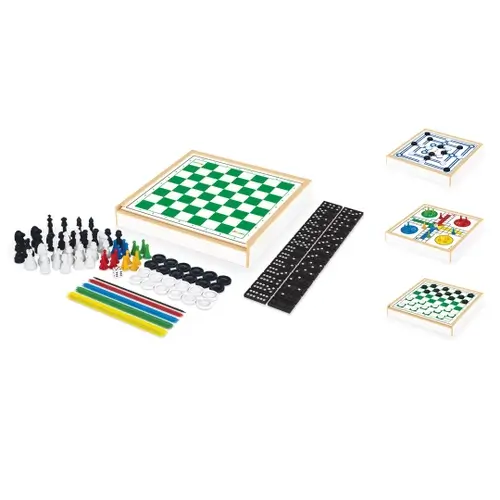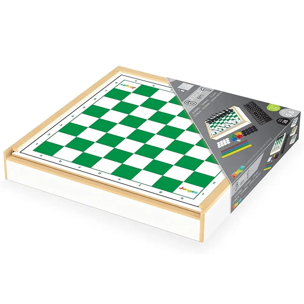 6 JOGOS EM 1 – JUNGEE CONTÉM: Xadrez tam. do rei 5,6 cm, damas, ludo, trilha, dominó c/ 28 peças, pega varetas c/ 31 peças, tabuleiro em mdf e manual de instruções dos jogos.