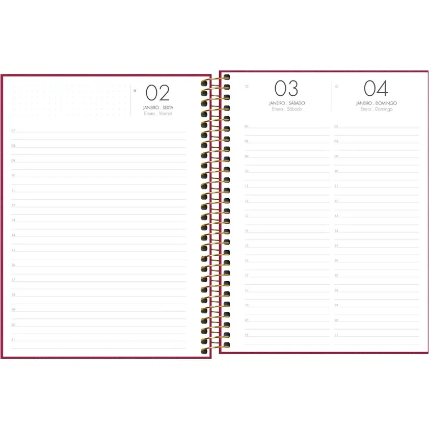 – Com bolsa plástica, folhas com visão de um dia por página, exceto aos sábados e domingos, e pautas com horário entre 7h e 21h.