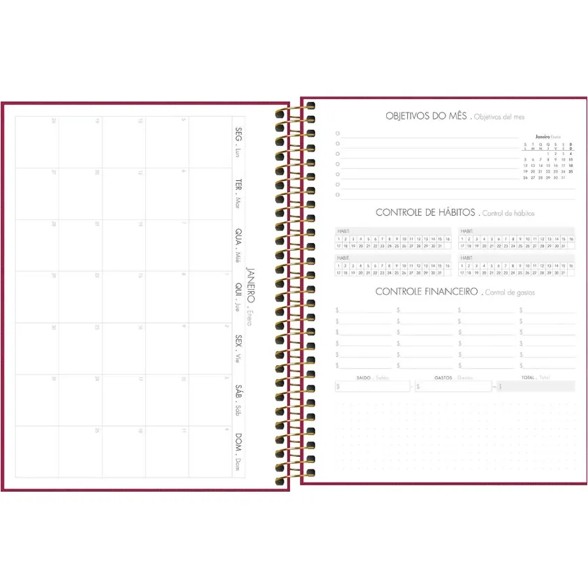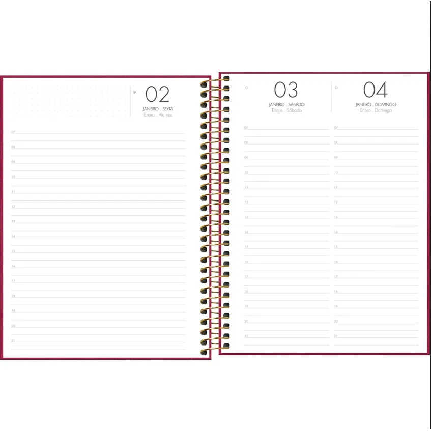 – Com bolsa plástica, folhas com visão de um dia por página, exceto aos sábados e domingos, e pautas com horário entre 7h e 21h.