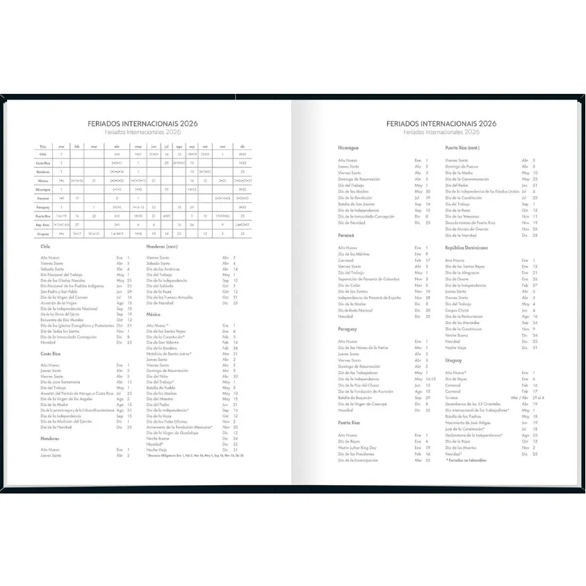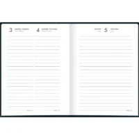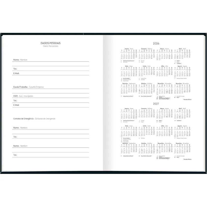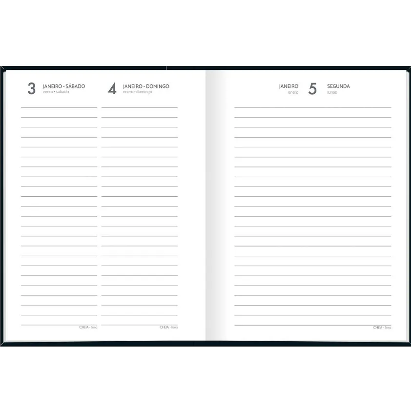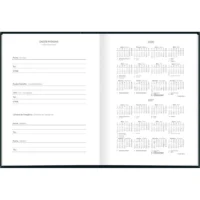 Com capa dura e folhas com visão de um dia por página, exceto aos sábados e domingos, com pautas para marcação de horário entre 7 e 18 horas.