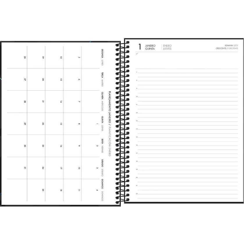 – Com capa dura com visual neutro e moderno, bolsa plástica, folhas com visão de um dia por página e pautas com horário entre 7h e 22h.