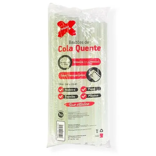 O Bastão Cola Quente de 11 mm X 30 cm com 1 Kg da marca Make+ é um produto de alta qualidade, super transparente e com secagem rápida. Este bastão grosso de 11,2 mm de diâmetro é ideal para uma variedade de aplicações, incluindo colagem de metal, cerâmica, papel, plástico, madeira, brinquedos, maquetes, flores artificiais, móveis e muito mais. Cada pacote contém 35 unidades, tornando-o perfeito para projetos de grande escala ou para uso contínuo. Com um peso líquido de 1 kg, você terá cola suficiente para todas as suas necessidades de colagem. A cola quente é conhecida pela sua força e durabilidade, e este produto não é exceção. A transparência da cola garante uma aparência limpa e profissional, enquanto a secagem rápida permite que você prossiga com seu projeto sem demora.