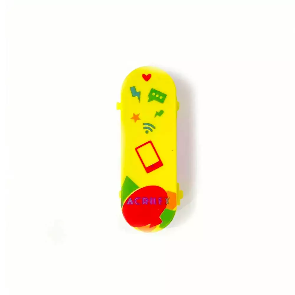 Borracha escolar criativa, super fofa e divertida. Tem forma de skate e vem nas cores azul e verde, amarelo e rosa e preto e azul. A borracha possui uma textura super macia e eficiente para apagar. Não tóxica.