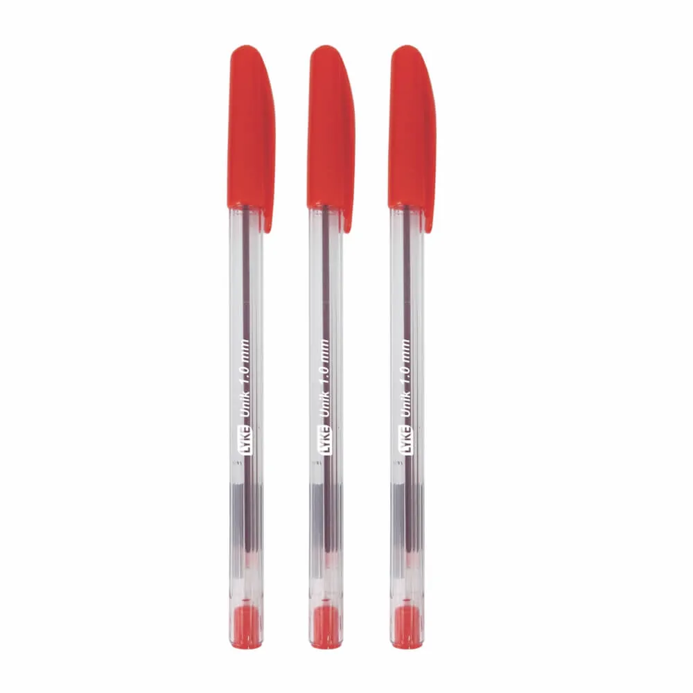 Caneta esferográfica Lyke. Ponta de latão de 1,0mm. Esfera de tungstênio. Resinas termoplásticas. Tinta a base de corantes orgânicos. Corpo da caneta transparente. Tampa anti-asfixiante. Clipe de bolso.