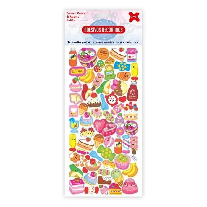 Explore o mundo da criatividade com os Adesivos Decorados, esta cartela de adesivos traz uma seleção vibrante e variada, ideal para personalizar e dar um toque especial a qualquer ambiente ou objeto.