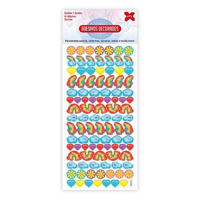 Explore o mundo da criatividade com os Adesivos Decorados, esta cartela de adesivos traz uma seleção vibrante e variada, ideal para personalizar e dar um toque especial a qualquer ambiente ou objeto.
