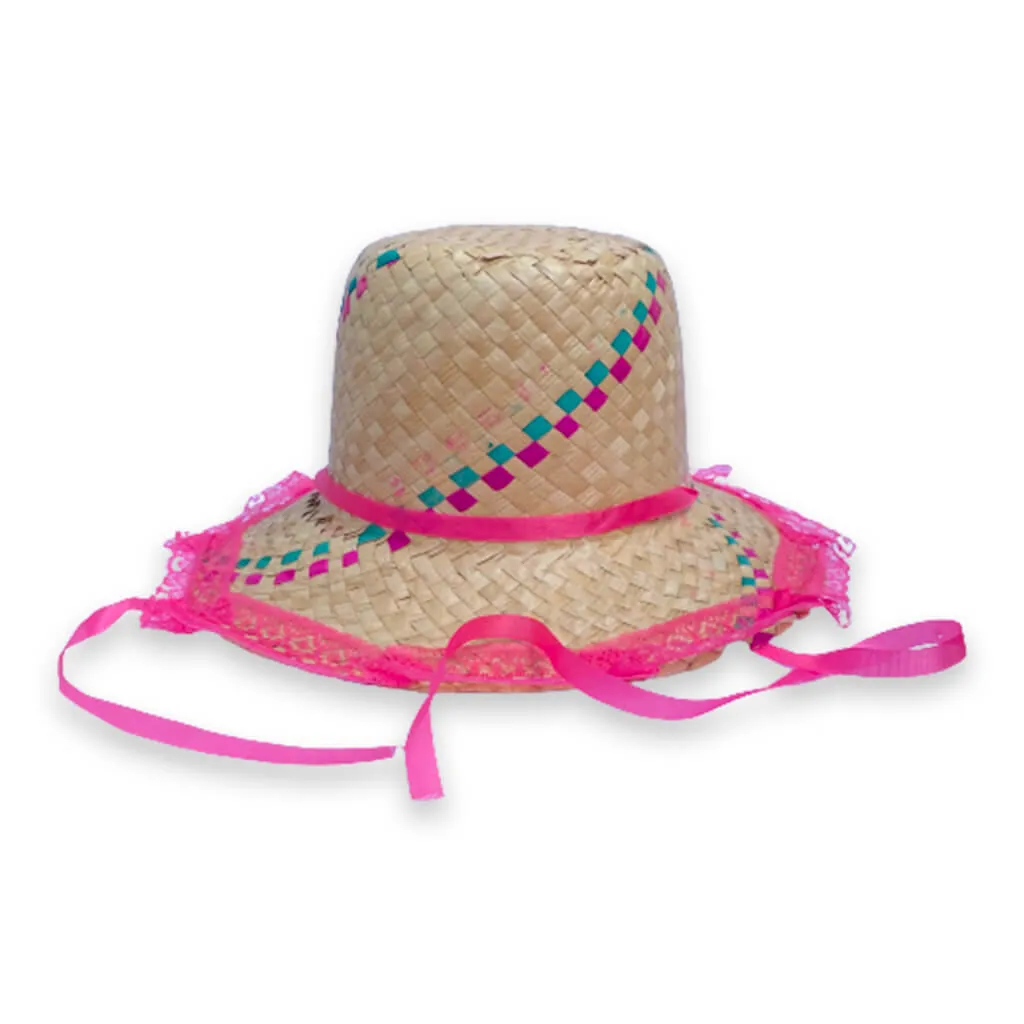 – Chapéu de palha. – Sem trança. – Com renda e fita. – Com detalhes coloridos.