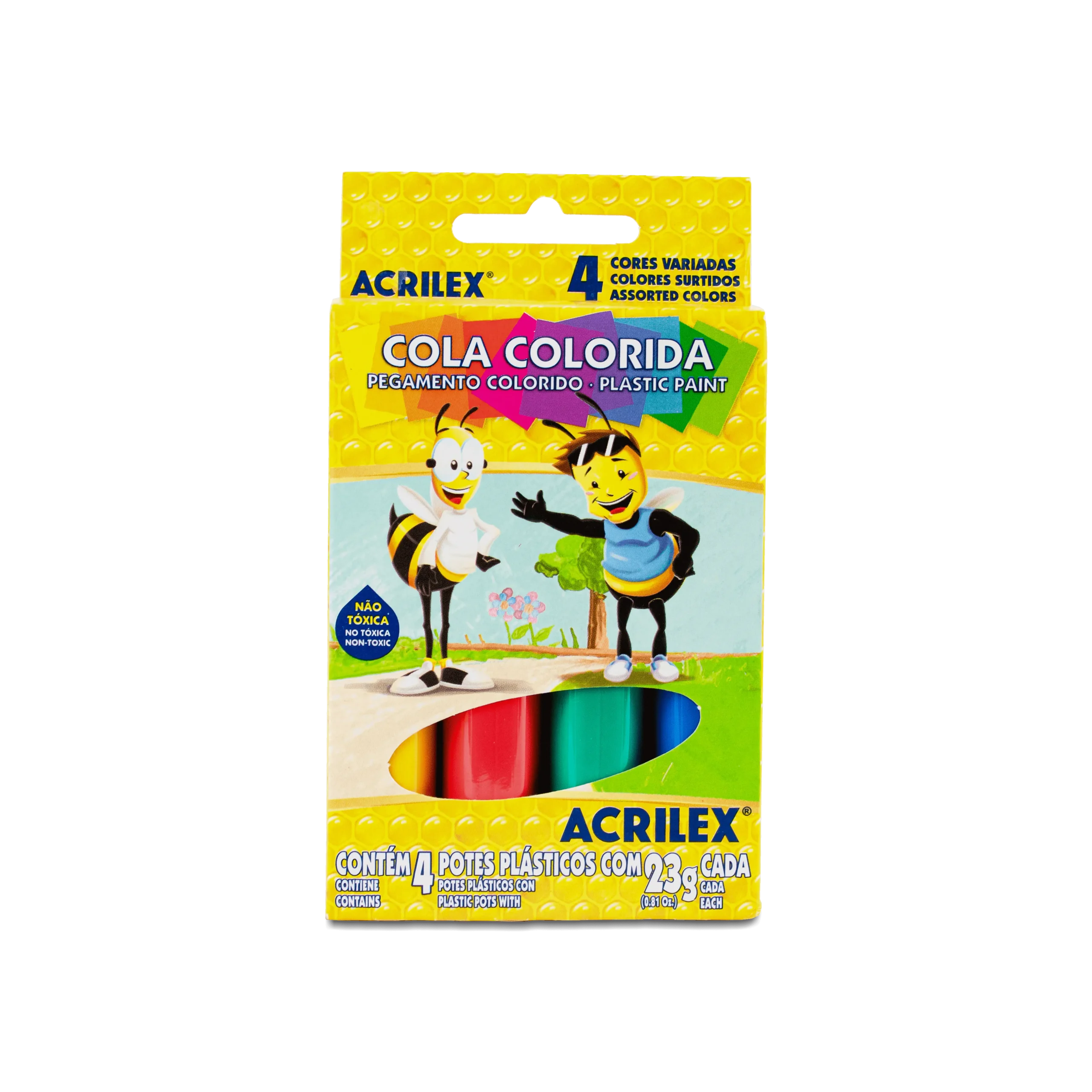 Ideal para trabalhos manuais de colagem, pintura ou até mesmo relevos coloridos, a Cola Colorida abelhinhas foi desenvolvida para facilitar o seu dia a dia e deixar aquela sensação doce, semelhante ao mel, seja na escola ou em casa, sem abrir mão de muita praticidade e qualidade. Possui secagem rápida, de excelente aderência e uniformidade com cores super vibrantes. É limpa e econômica, possui tampa rosqueável, evitando vazamentos e trazendo segurança no armazenamento. Com capacidade de 23g e embalagem plástica, acompanha quatro cores diferentes! Sem dúvidas, a Cola Colorida Acrilex trará a fofura das abelhinhas ao seu material!