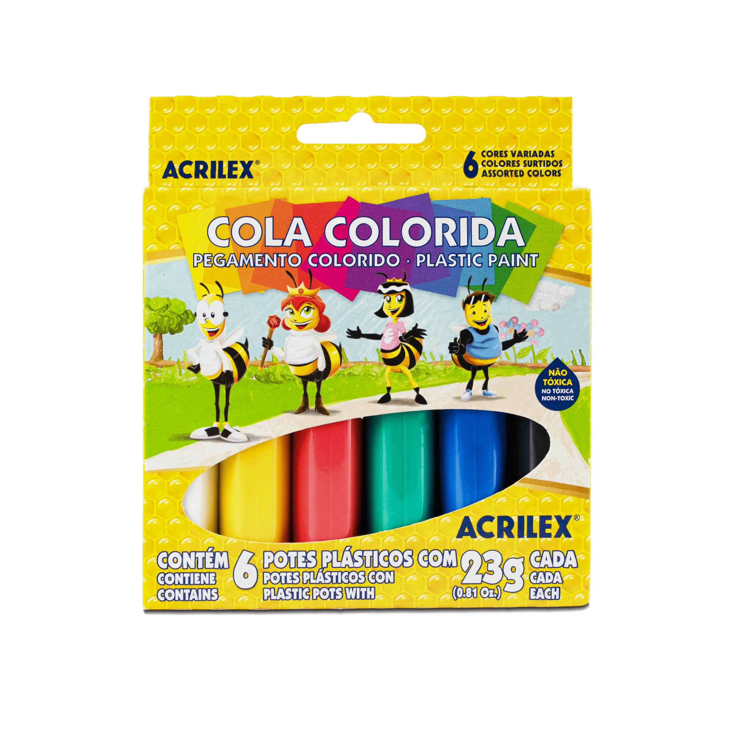 Ideal para trabalhos manuais de colagem, pintura ou até mesmo relevos coloridos, a Cola Colorida abelhinhas foi desenvolvida para facilitar o seu dia a dia e deixar aquela sensação doce, semelhante ao mel, seja na escola ou em casa, sem abrir mão de muita praticidade e qualidade. Possui secagem rápida, de excelente aderência e uniformidade com cores super vibrantes. É limpa e econômica, possui tampa rosqueável, evitando vazamentos e trazendo segurança no armazenamento. Com capacidade de 23g e embalagem plástica, acompanha quatro cores diferentes! Sem dúvidas, a Cola Colorida Acrilex trará a fofura das abelhinhas ao seu material!
