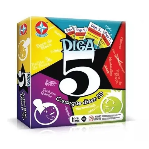 DIGA 5 – ESTRELA CONTÉM: 1 ampulheta, 1 tabuleiro, 6 peões, 100 cartas e 1 dado.