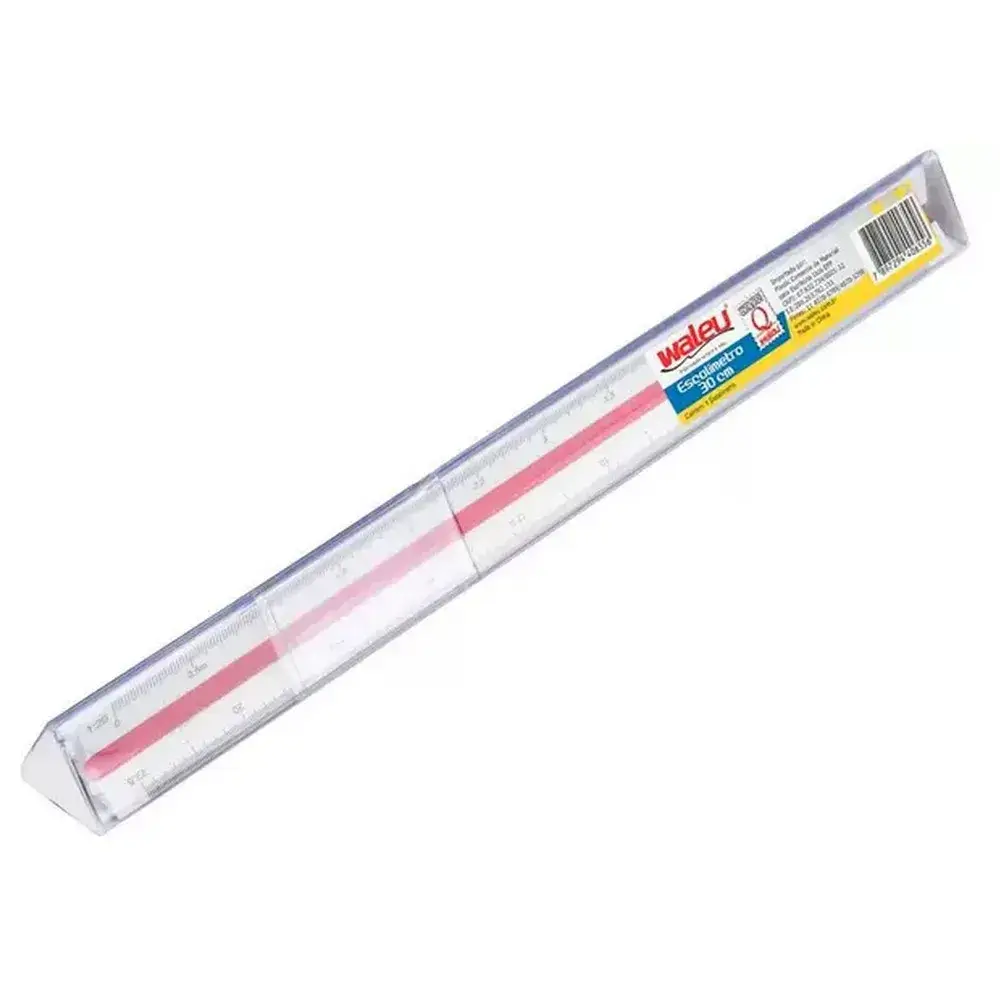 – Escalímetro tem formato triangular, totalizando 6 réguas com diferentes escalas.