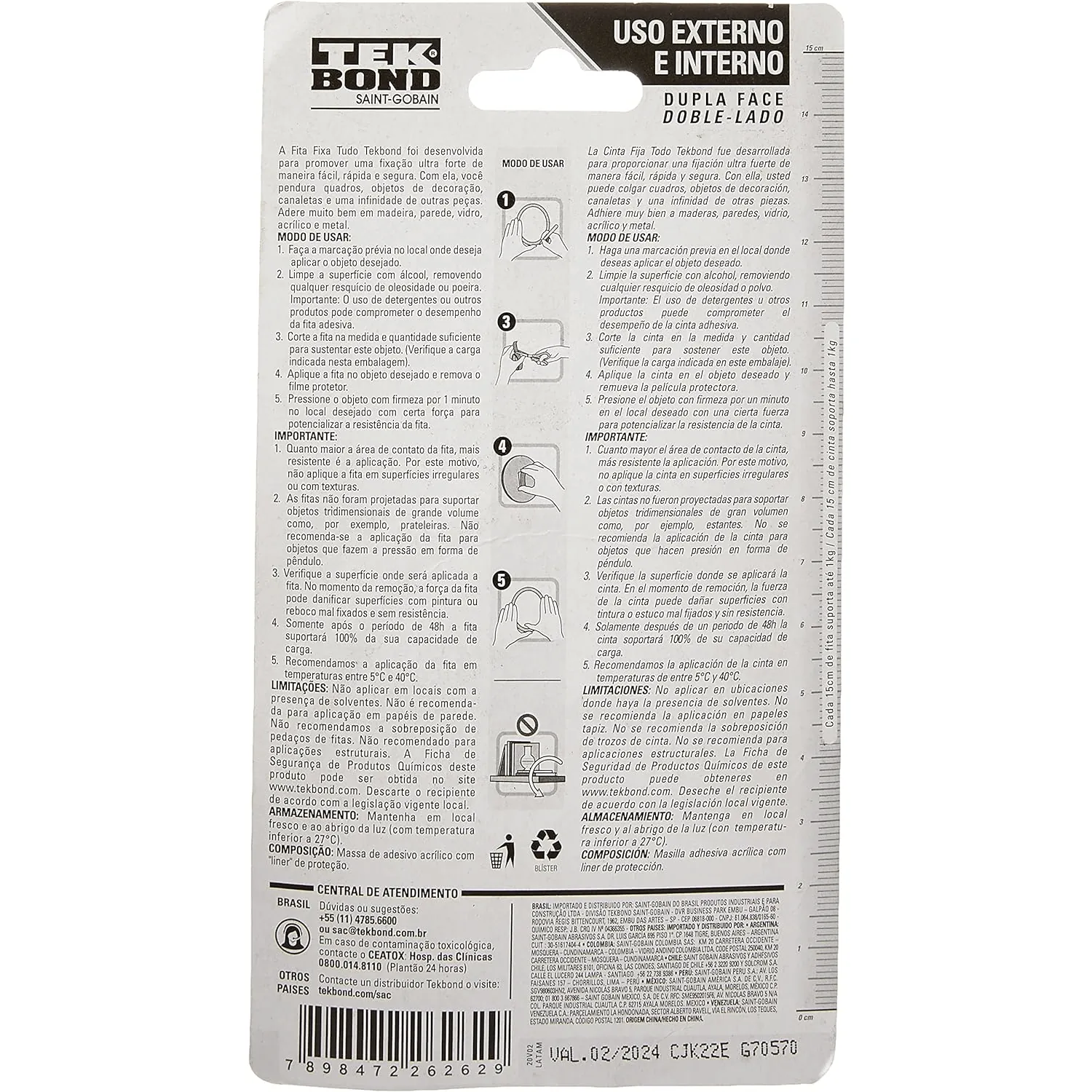 Fita Dupla Face Tek Bond, foi desenvolvida para promover uma forte fixação, rápida e segura. Você poderá fixar vários objetos como: canaletas, quadros, fixar madeira em algumas superfícies, vidro, metal, acrílico. Fazer teste de aderência na peça para ver se terá boa fixação.