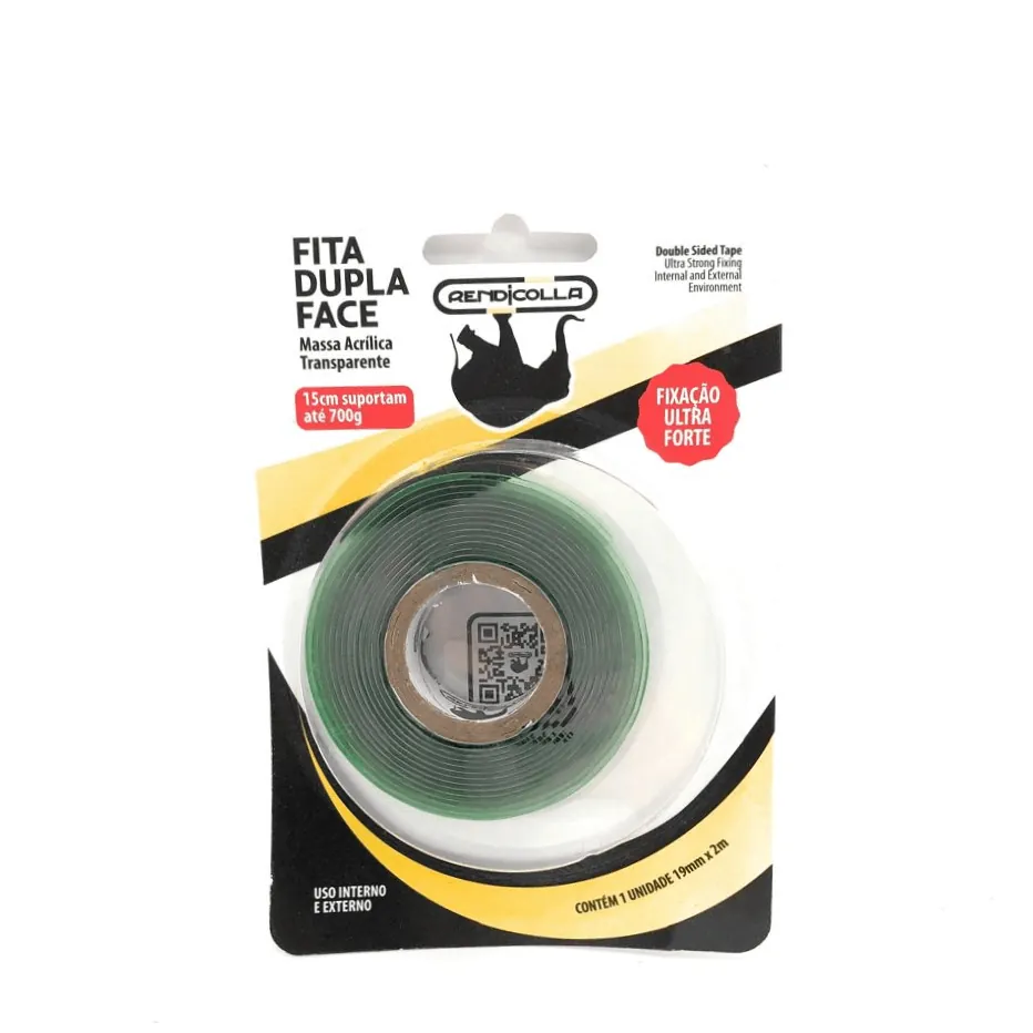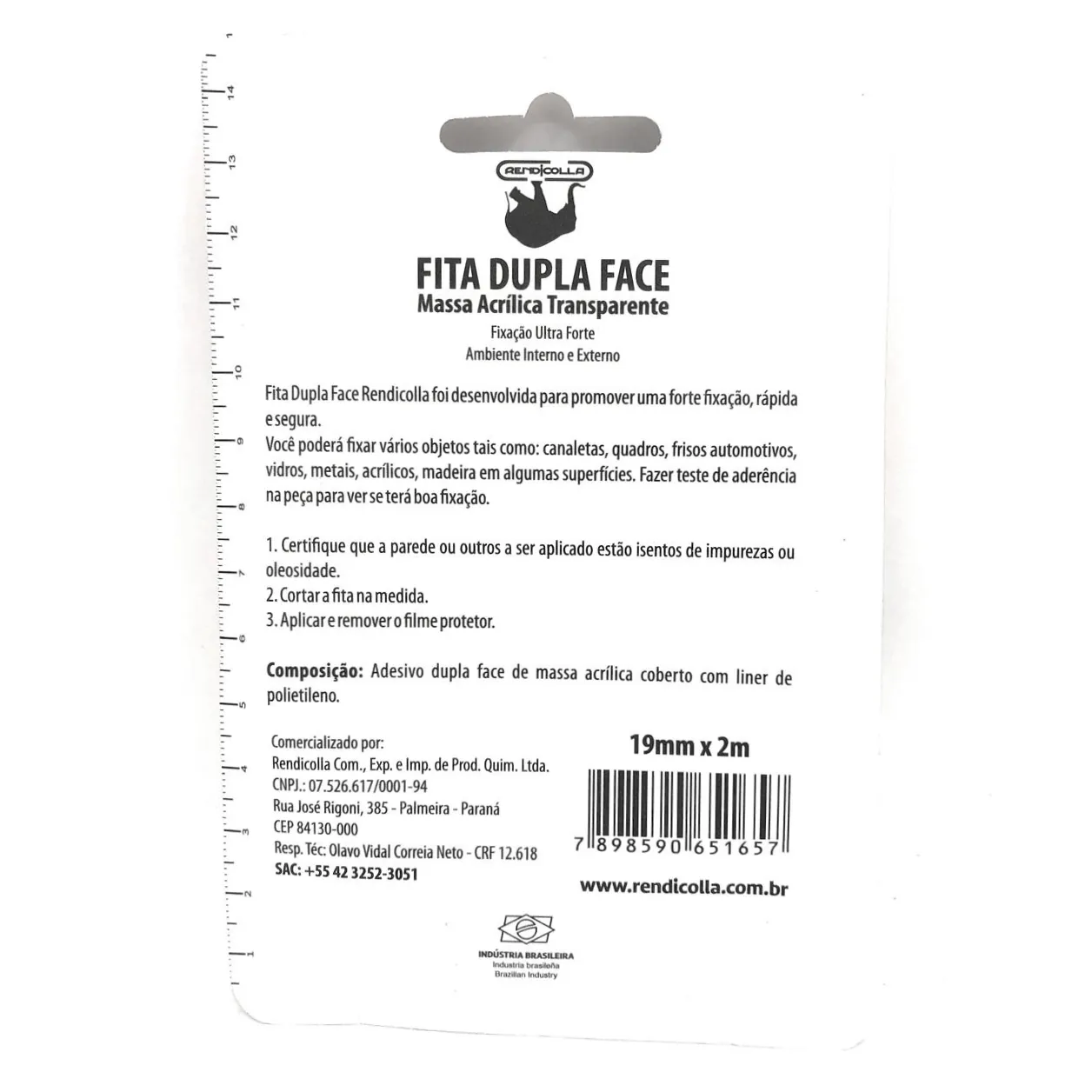 Fita Dupla Face Fixação Forte Rendicolla, foi desenvolvida para promover uma forte fixação, rápida e segura. Você poderá fixar vários objetos como: canaletas, quadros, fixar madeira em algumas superfícies, vidro, metal, acrílico. Fazer teste de aderência na peça para ver se terá boa fixação.