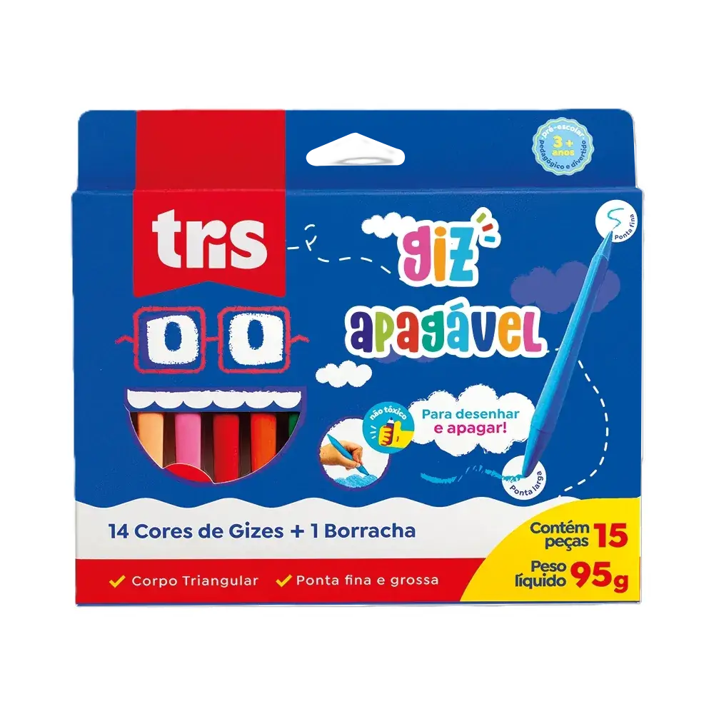 Giz De Cera Apagável.Características:– 14 Cores De Gizes.– 1 Borracha.– Corpo Triangular.– Ponta Fina e Grossa.Composição:– Ceras, Carga, Mineral inerte e Pigmentos.