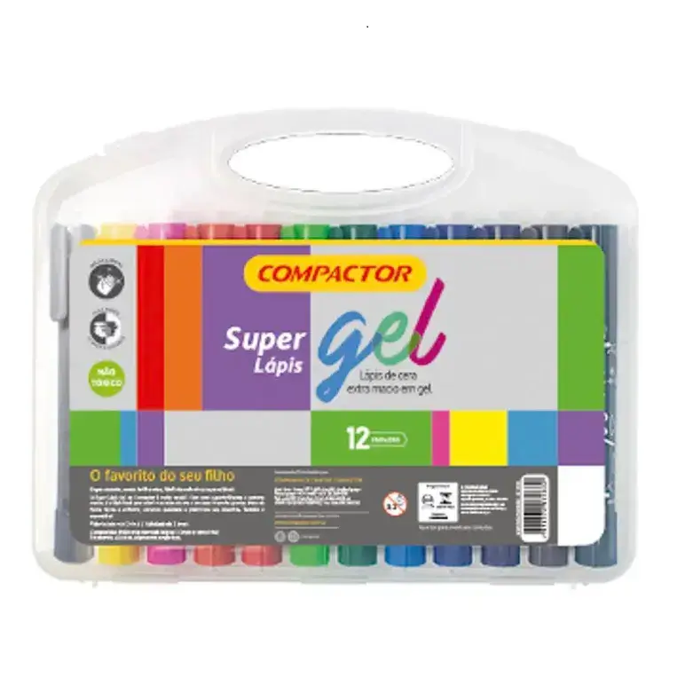O Super Lápis Gel da Compactor é um lápis de cera inserido em um corpo plástico super divertido, equipado com mecanismo de acionamento/retração por rotação, tipo batom. Materiais 100% não tóxicos. Proporcionam uma atividade mais segura, limpa e organizada. para usar a vontade sem sujar as mãos.