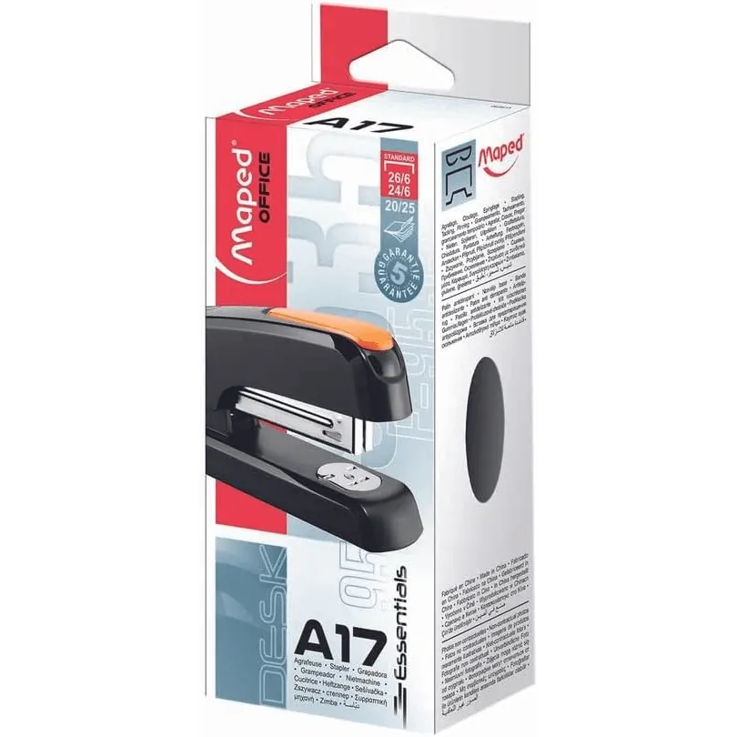Este grampeador de mesa da Maped combina funcionalidade, qualidade e resistência. Possui estrutura em aço polido, acabamento em plástico e apoios emborrachados que proporcionam conforto durante o manuseio.