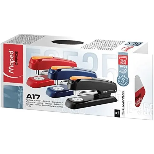 Este grampeador de mesa da Maped combina funcionalidade, qualidade e resistência. Possui estrutura em aço polido, acabamento em plástico e apoios emborrachados que proporcionam conforto durante o manuseio.