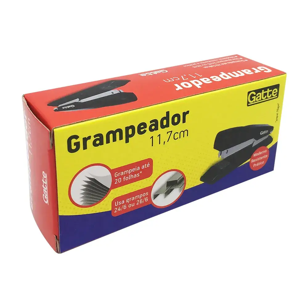 Grampeador metálico Gatte produzido em aço, base de apoio em plástico e pintura eletrostática de alta resistência. Características: Grampeia até 20 folhas e usa grampos 24/6 ou 26/6. Dimensões: 117mm x 55mm x 33mm. Cor: Preto.