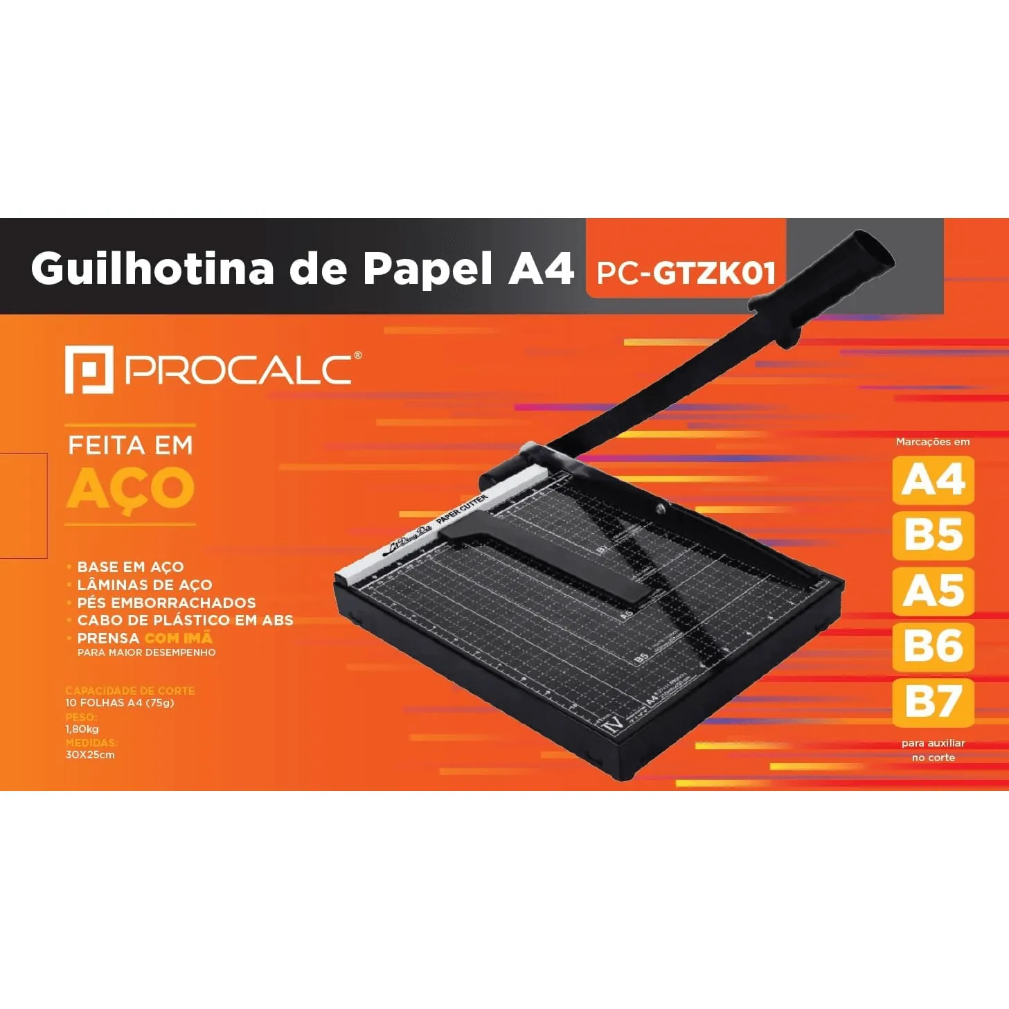 Guilhotina De Papel A4 10 Folhas Preta PC-GTZK01 Procalc, pode ser usada nos trabalhos de corte em encadernação, plastificação, e outros trabalhos manuais com papel.
