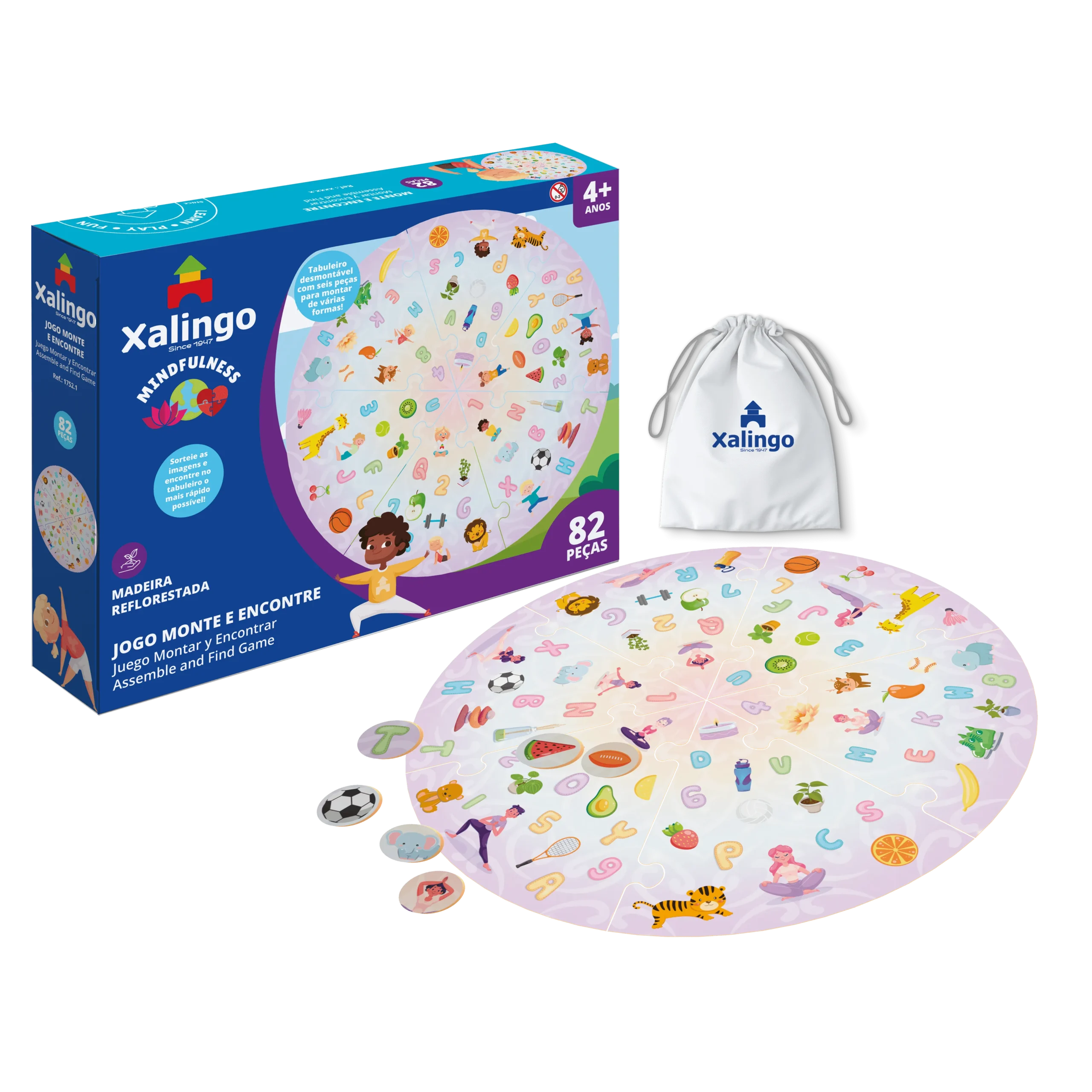 O Jogo Monte e Encontre da Xalingo, consiste em um tabuleiro desmontável de seis peças, ilustrado com diversos itens, objetos, animais, letras e números, acompanhado de um saquinho com fichas com esses mesmos objetos.