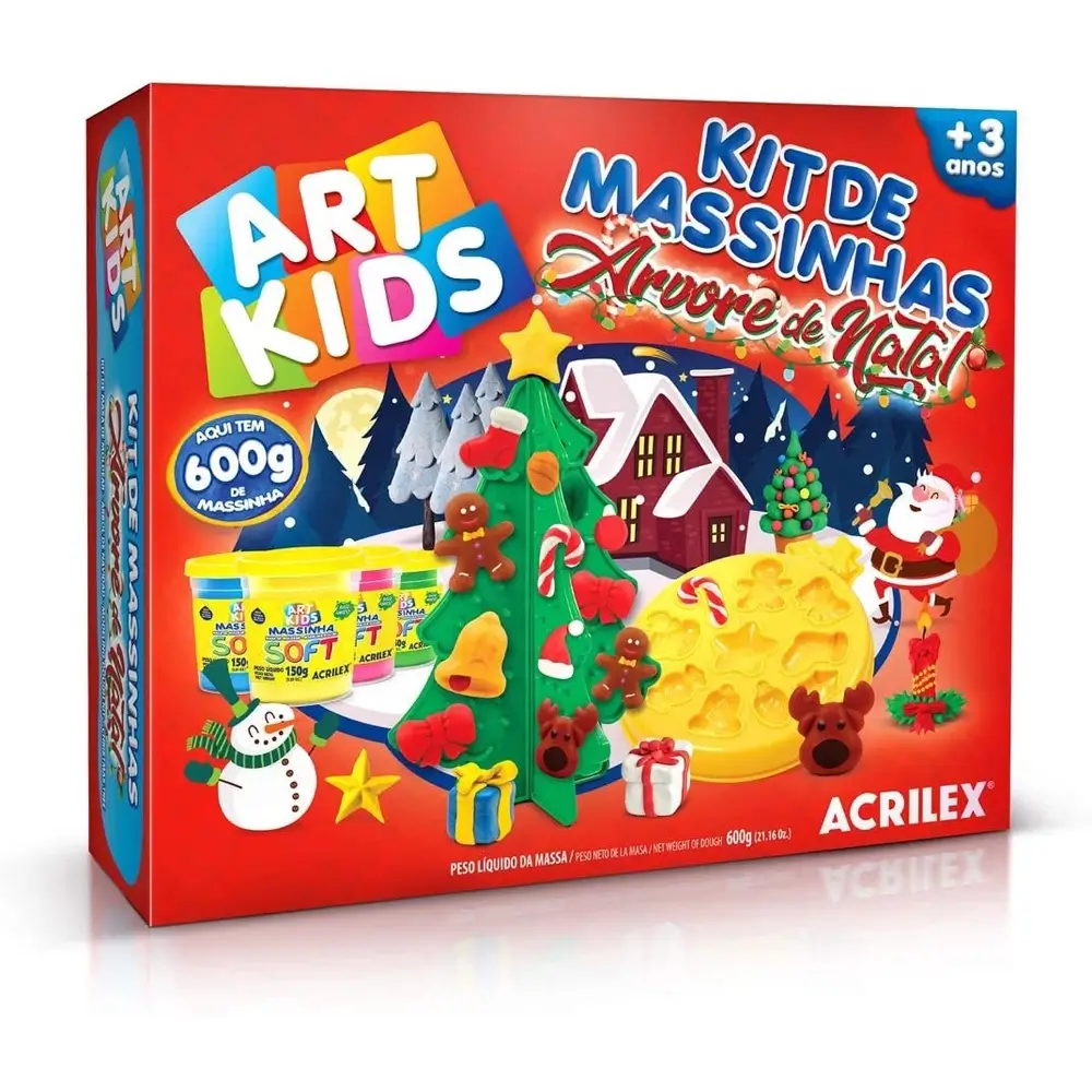 KIT DE MASSINHA ÁRVORE DE NATAL – ACRILEX CONTÉM: 4 potes de massinha de modelar 150 g cada, 2 peças que formam uma árvore de Natal, 2 faquinhas, 1 molde com diversos formatos, 3 enfeites em formato de presente e 1 cenário (em papel).
