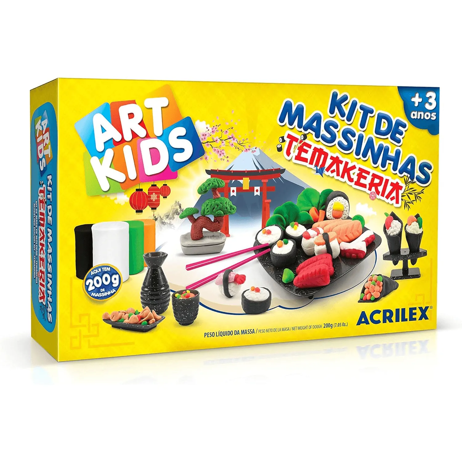 KIT DE MASSINHA TEMAKERIA – ACRILEX CONTÉM: 4 massinhas de modelar 50 g cada, 1 prato, 2 moldes, 2 faquinhas, 1 porta temaki, 1 porta shoyu, 1 par de hashi e 2 acessórios.