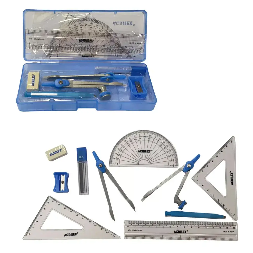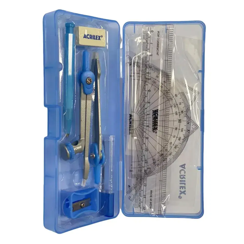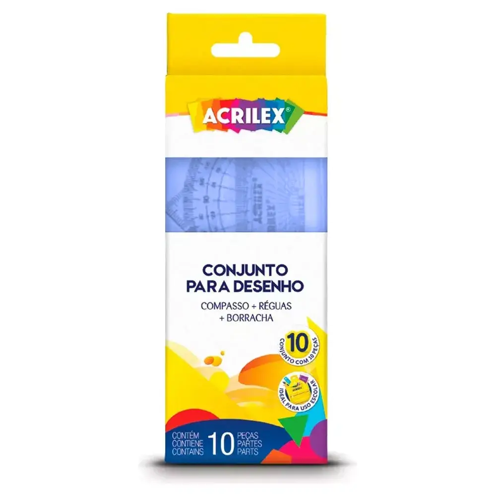 O Kit de desenho geométrico da Acrilex é ideal para o material escolar, com todas as ferramentas necessárias para fazer um desenho técnico, e com um compartimento para deixar tudo mais compacto e fácil na hora de pôr na mochila.