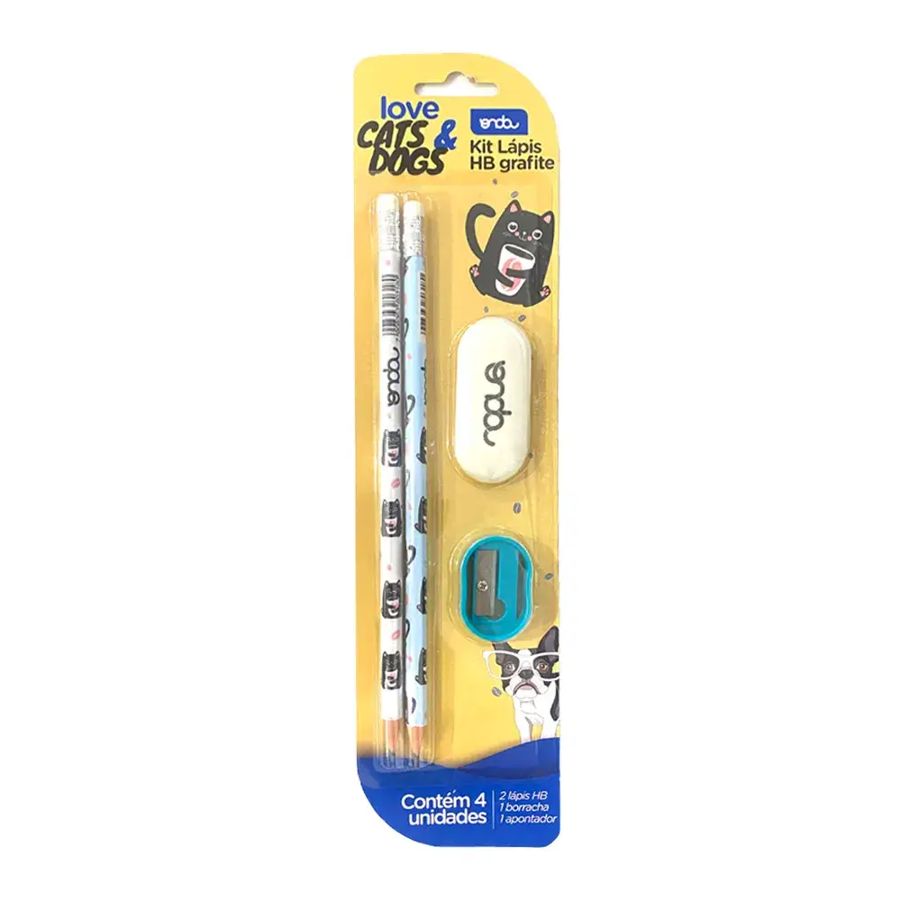 O Kit com 4 Itens Love Cats and Dogs Onda possui 02 unidades Lápis Grafite HB – Nº2, para escrita, desenhos artísticos e técnicos; borracha oval e um apontador simples. Os lápis têm formato redondo, possuem borracha na extremidade e corpo estampado com Love Cats and Dogs.