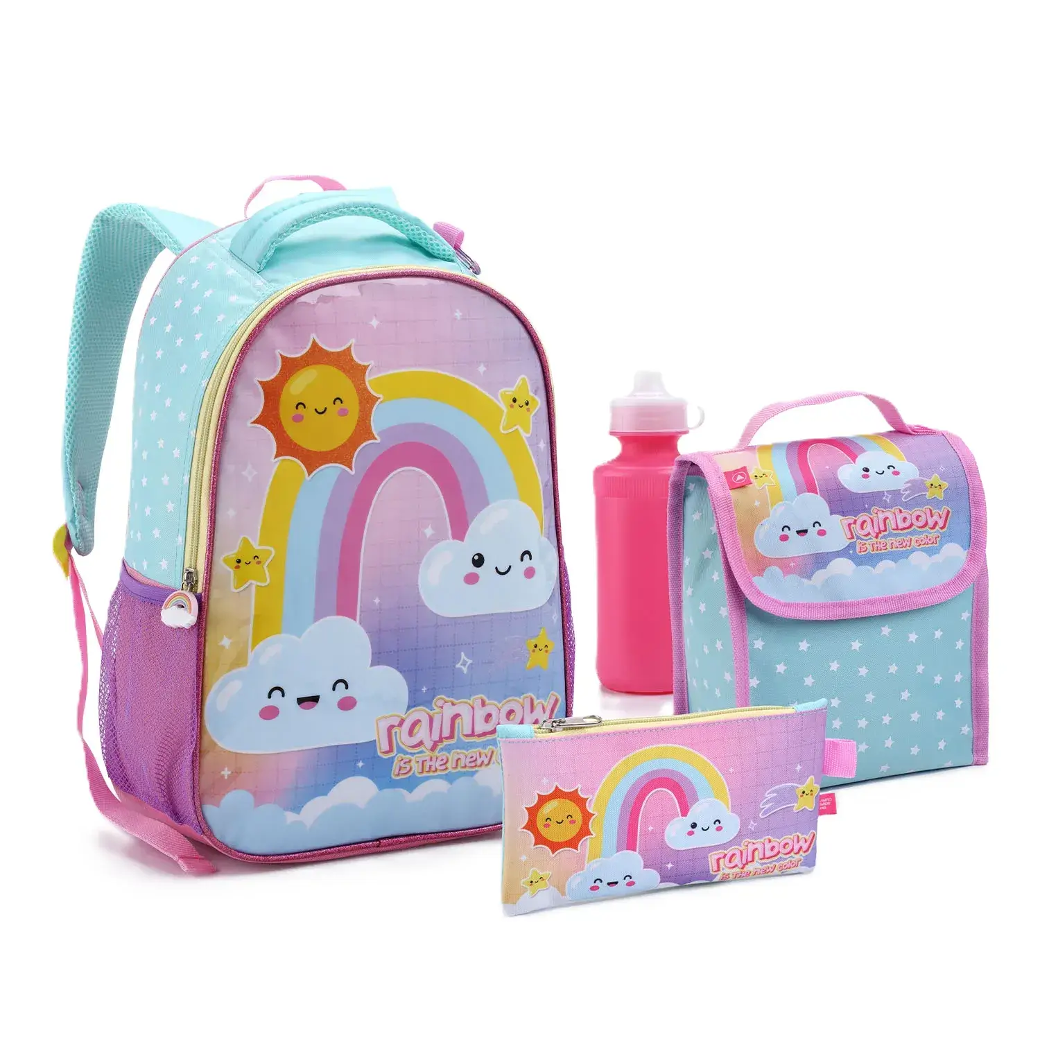 KIT INFANTIL ESCOLAR FEMININO COMPOSTO POR: MOCHILA, LANCHEIRA, ESTOJO, GARRAFA E MOSQUETÃO. MOCHILA INFANTIL FEMININA FEITA COM 70% POLIÉSTER E 30% PVC. POSSUI BOLSOS LATERAIS PORTA GARRAFA, PUXADORES PERSONALIZADOS E IDENTIFICADOR NO VERSO. MEDIDAS: 29 X 41 X 12,5CM. LANCHEIRA TÉRMICA INFANTIL FEMININA 100% POLIÉSTER. POSSUI FECHAMENTO EM VELCRO E ELÁSTICO INTERNO PARA FIXAÇÃO DE GARRAFA. MEDIDAS: 16 X 20 X 11CM. ESTOJO INFANTIL FEMININO 100% POLIÉSTER. MEDIDAS: 20,5 X 11CM.