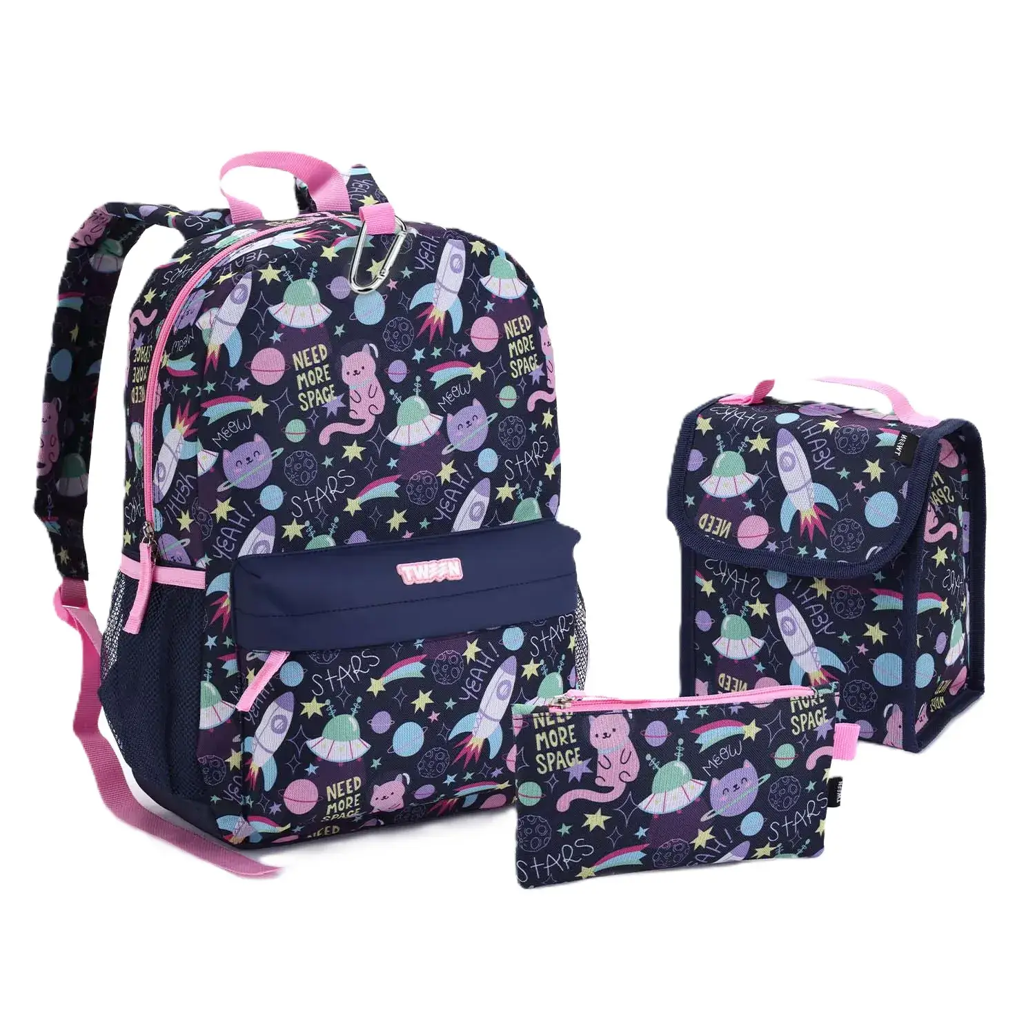 KIT INFANTIL ESCOLAR FEMININO COMPOSTO POR: MOCHILA, LANCHEIRA, ESTOJO E MOSQUETÃO. MOCHILA INFANTIL FEMININA 16″ FEITA COM 90% POLIÉSTER E 10% PVC. POSSUI BOLSOS LATERAIS PORTA GARRAFA, IDENTIFICADOR NO VERSO E DETALHE EMBORRACHADO. MEDIDAS: 29 X 40,5 X 12,5CM. LANCHEIRA TÉRMICA INFANTIL FEMININA 100% POLIÉSTER. POSSUI FECHAMENTO EM VELCRO E ELÁSTICO INTERNO PARA FIXAÇÃO DE GARRAFA. MEDIDAS: 16 X 20 X 11CM. ESTOJO INFANTIL FEMININO 100% POLIÉSTER. MEDIDAS: 20,5 X 11CM.