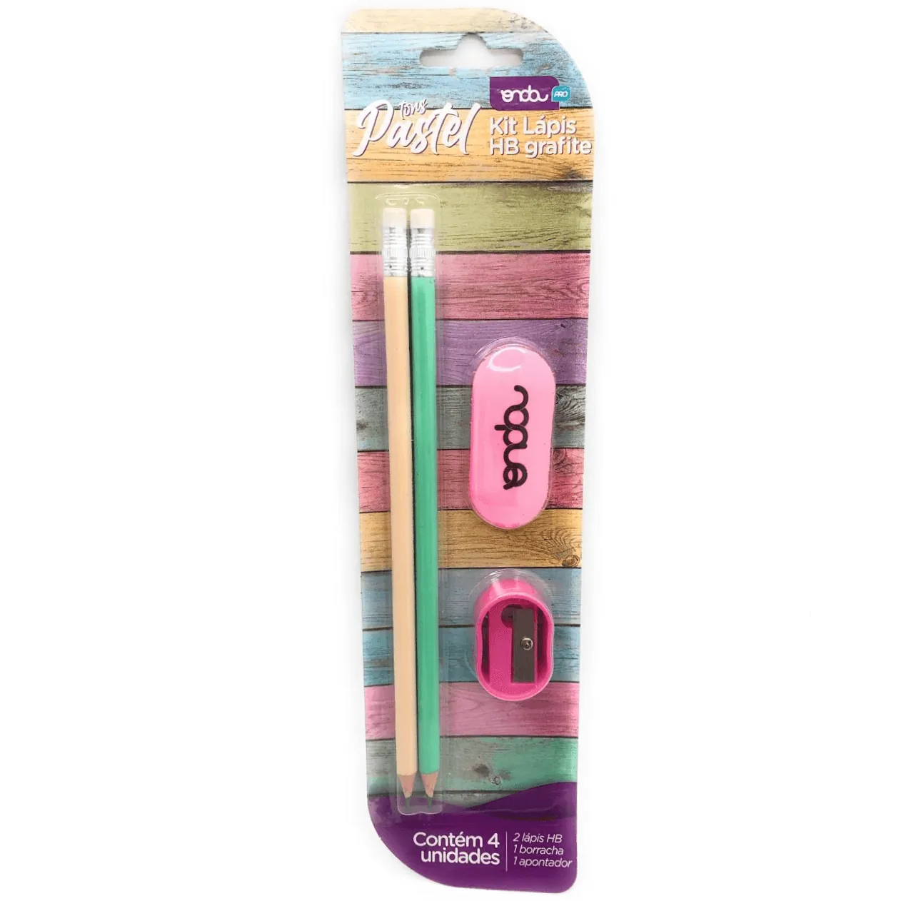 O kit contém 2 lápis HB, 1 borracha oval e 1 apontador;Lápis: Resina plástica, pigmentos e cera;Apontador: Resina termoplásica e lâmina em aço;Borracha: Isenta de PVC, carga inerte de pigmento atóxico;Demais produtos que compõem a foto não acompanham o kit escolar.