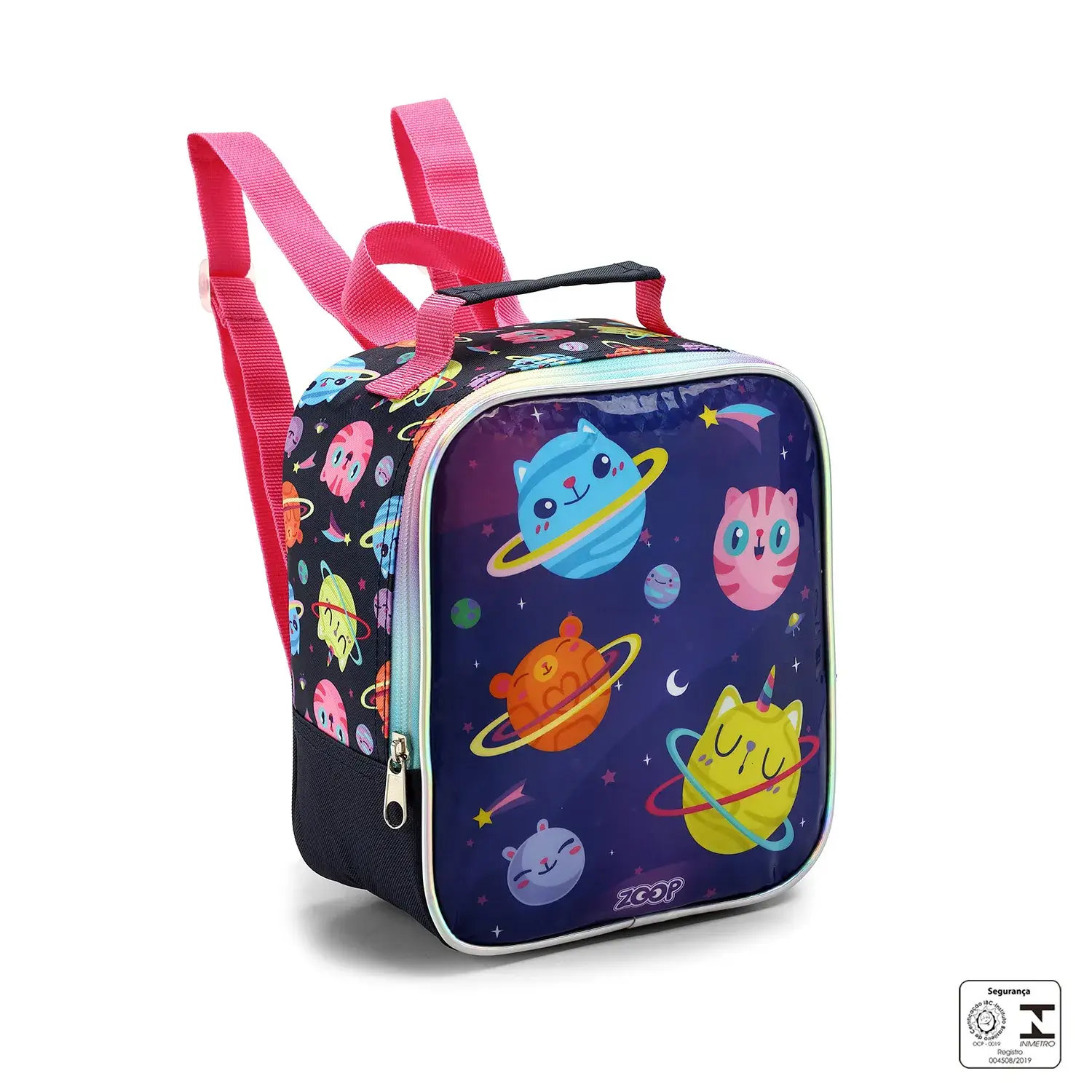LANCHEIRA TÉRMICA INFANTIL 70% POLIÉSTER E 30% PVC. POSSUI IDENTIFICADOR NO VERSO, ELÁSTICO INTERNO PARA FIXAÇÃO DA GARRAFA, ALÇA E ELÁSTICO NAS COSTAS PARA FIXAÇÃO NO CARRINHO 20X22X11CM.