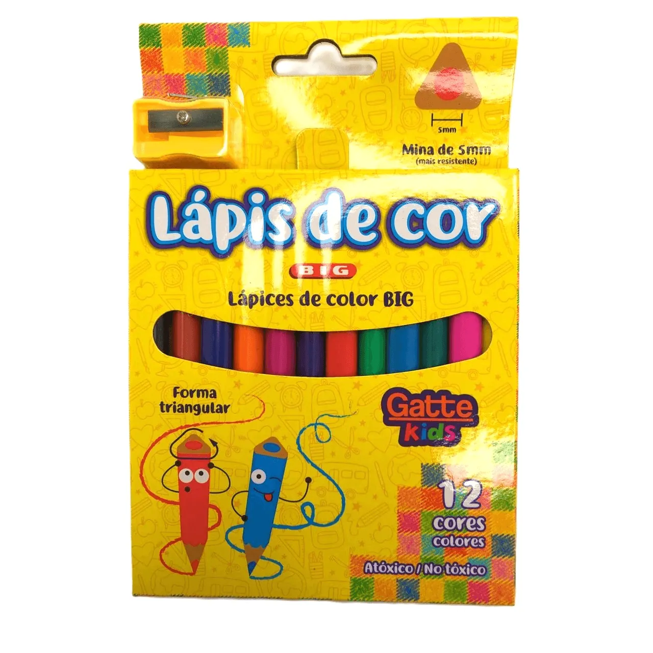 – 12 cores. – Cores vivas. – Formato triangular Big/ Jumbo. – Ergonômico. – Com apontador.