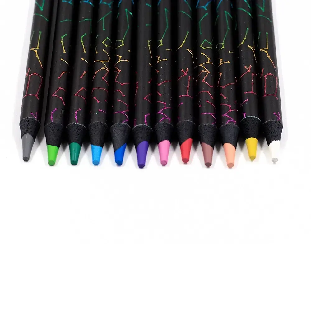 A paleta Noturna reinventa as 12 cores clássicas e expande as possibilidades de criação ao oferecer excelente pigmentação no papel claro ou escuro. Possui mina de 4.0mm, o corpo redondo e estampas holográficas.