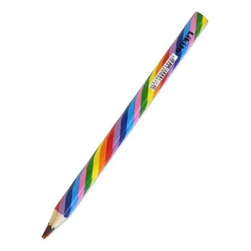 O lápis de cor LYKE arco-íris de madeira possui em sua ponta várias cores e quando utilizado em papel tem o traçado multicolorido.