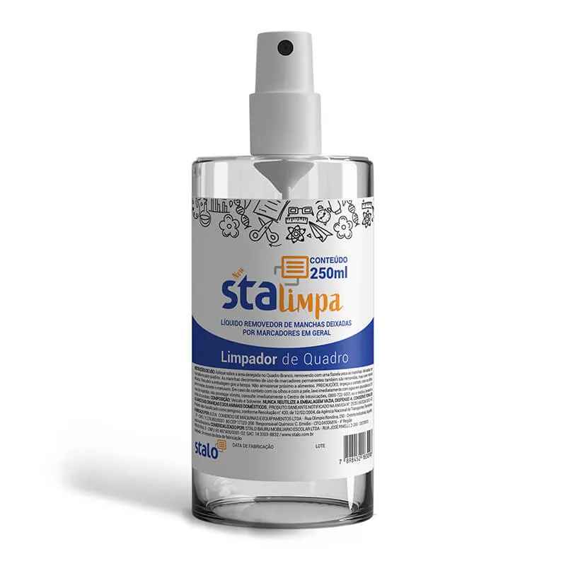 Os limpadores de quadros Stalo são especialmente desenvolvidos para quadros brancos e lousas escolares. Nosso limpador remove todas as marcas de tinta, resíduos e manchas de marcadores de quadro branco, deixando a superfície brilhante e pronta para o próximo uso. Disponível em dois tamanhos: 60 ml e 250 ml.