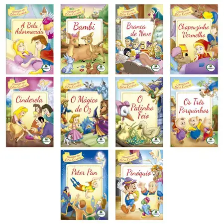 Com esta coleção, os pequenos irão exercitar a leitura em letra cursiva de maneira fluída e agradável. Títulos: – A Bela Adormecida – Bambi – Branca de Neve – Chapeuzinho Vermelho – Cinderela – O Mágico de Oz – O Patinho Feio – Os Três Porquinhos – Peter – Pinóquio