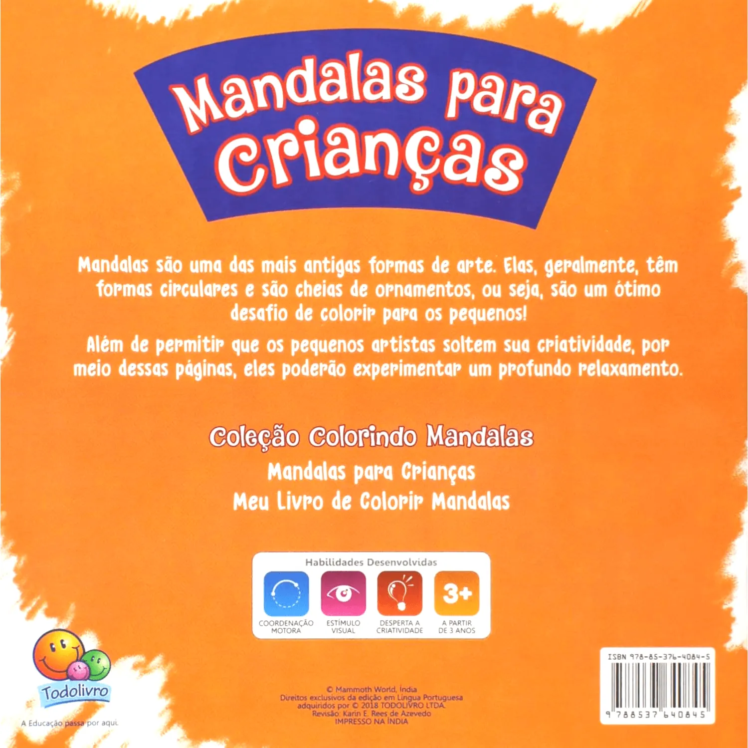 Excelente ferramenta para introduzir as formas geométricas (triângulos, estrelas, círculos). • Desenvolve a concentração, as capacidades psicomotoras, desperta a criatividade e a imaginação. • Ótimo desafio de colorir para os pequenos! Mandalas são uma das mais antigas formas de arte. Elas, geralmente, têm formas circulares e são cheias de ornamentos, ou seja, são um ótimo desafio de colorir para os pequenos! Além de permitir que os pequenos artistas soltem sua criatividade, por meio dessas páginas, eles poderão experimentar um profundo relaxamento.