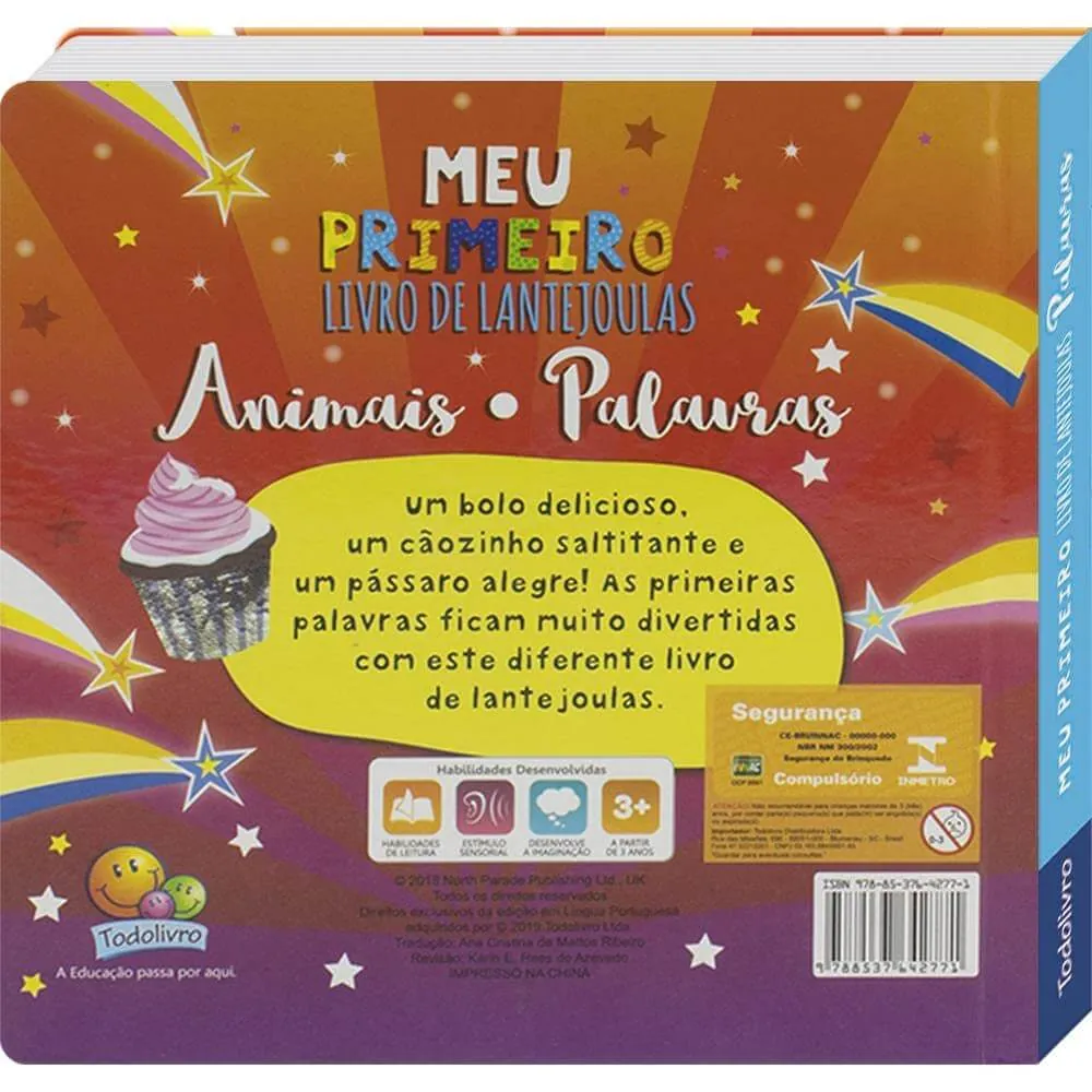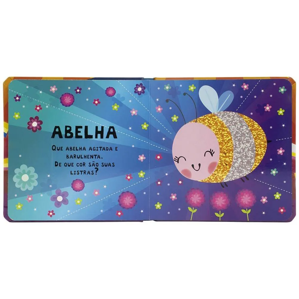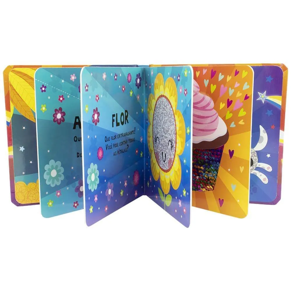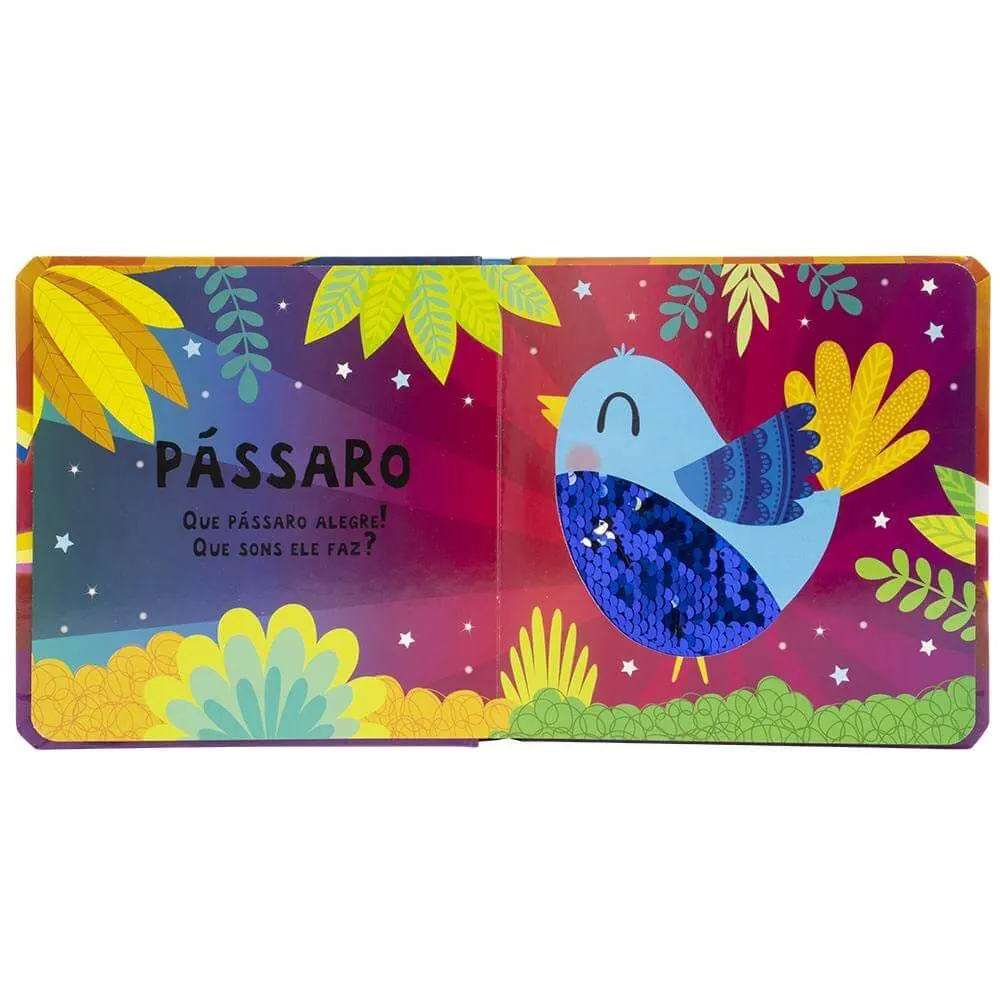Um bolo delicioso, um cãozinho saltitante e um pássaro alegre! As primeiras palavras ficam muito divertidas com este diferente livro de lantejoulas.