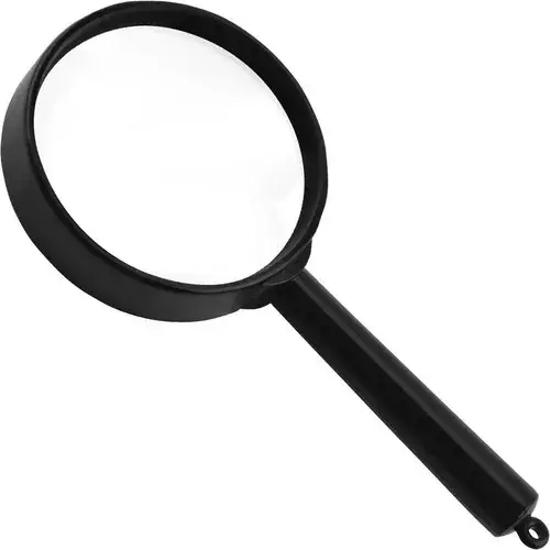 Lupa de aumento pequena multiuso 40mm, possui cabo de plástico e lente anti-deformação. Sua lente amplia em até 5x, facilitando a leitura e visualização de objetos muito pequenos e documentos.