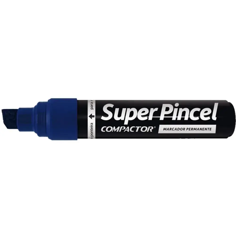 CANETA MARCADOR PERMANENTE SUPER PINCEL COMPACTOR – AZULTinta permanente com alta resistência para trabalhos pesados.Boa performance em diversas superfícies, com ponta chanfrada de traço 4mm a 12mm. Fácil recarga.