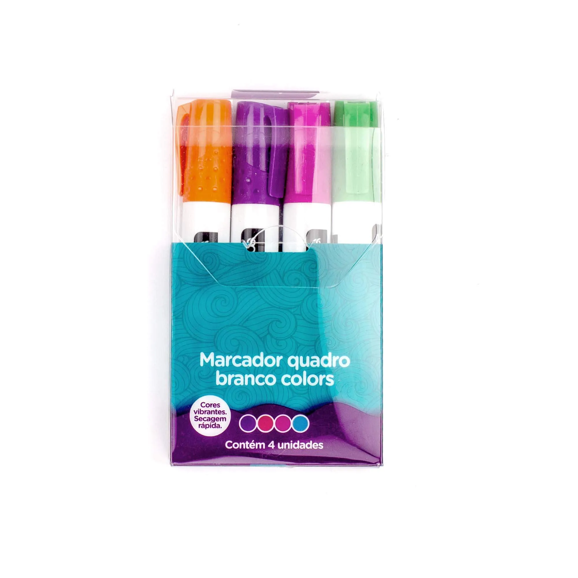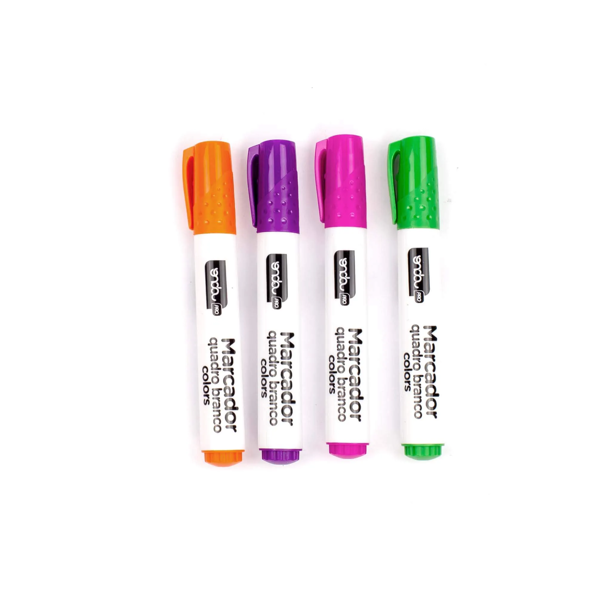 Corpo em resina termoplástica, ponta de fibra e tinta à base de água e corantes.