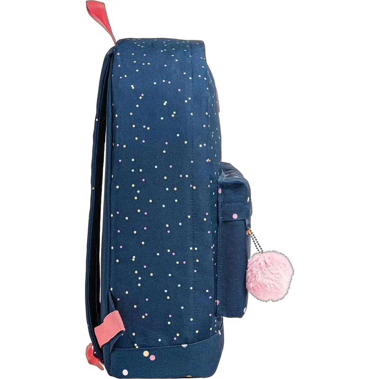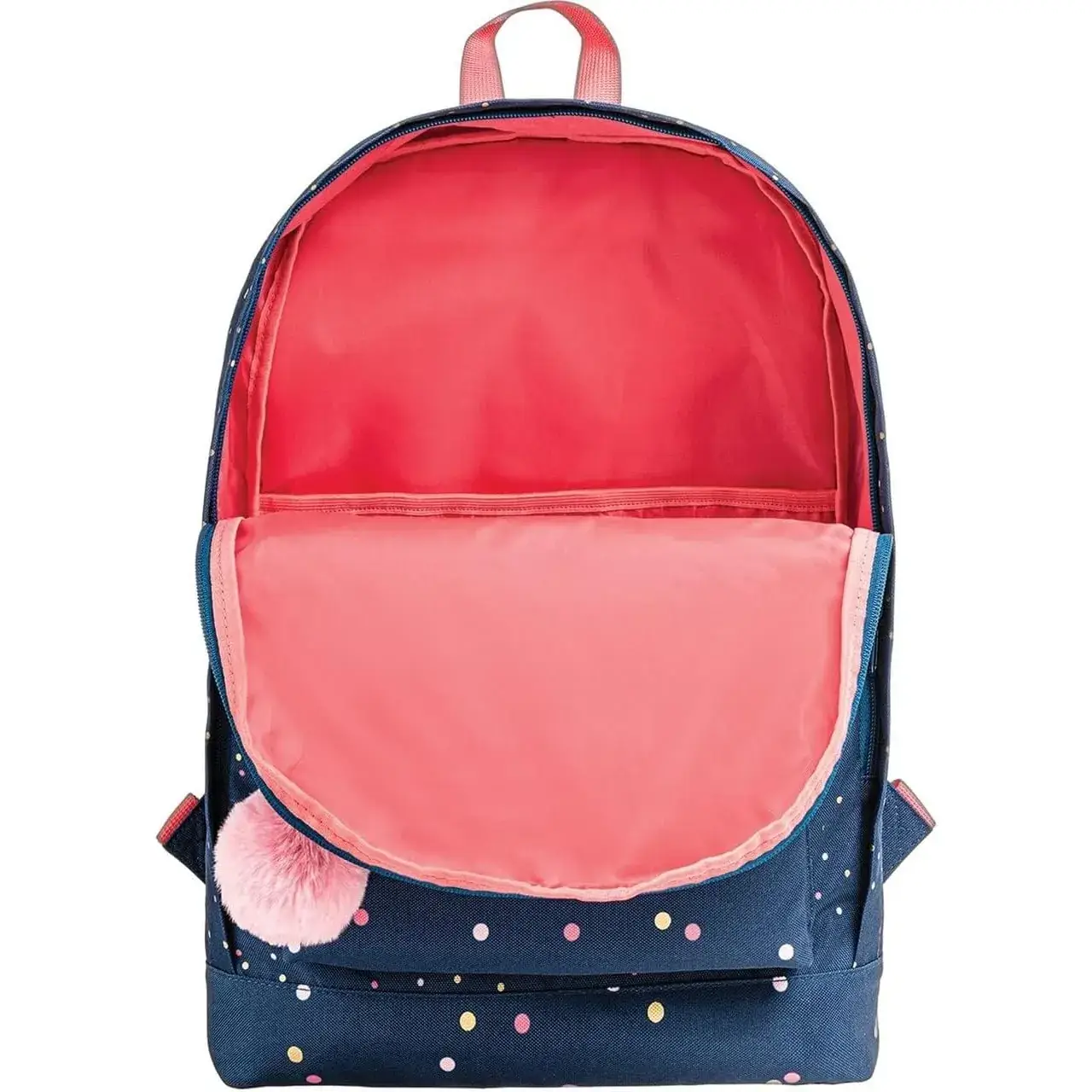 A Mochila de Costas Académie Dots é confeccionada em material resistente, com base reforçada, parte interna forrada e alças acolchoadas e ajustáveis para garantir conforto a quem utilizá-la. Possui dois compartimentos, sendo um bolso externo e uma abertura principal, com divisória interna, além de um bolso lateral, para armazenamento de materiais do dia a dia.