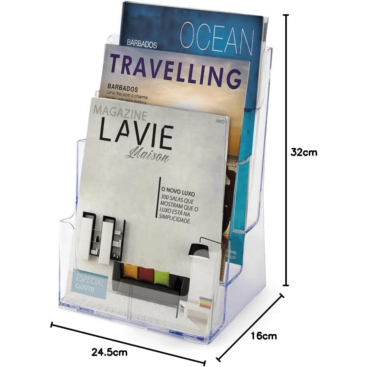 Ideal para ser fixado na parede, o Organizador Triplo Vertical também pode ser utilizado sobre a mesa, proporcionando flexibilidade e praticidade para qualquer ambiente de trabalho. Produzido em poliestireno resistente, sua transparência cristal adiciona um toque de elegância e modernidade, combinando com diversos estilos de decoração.