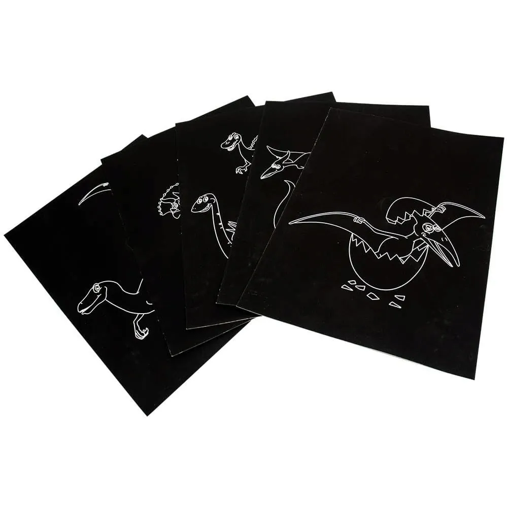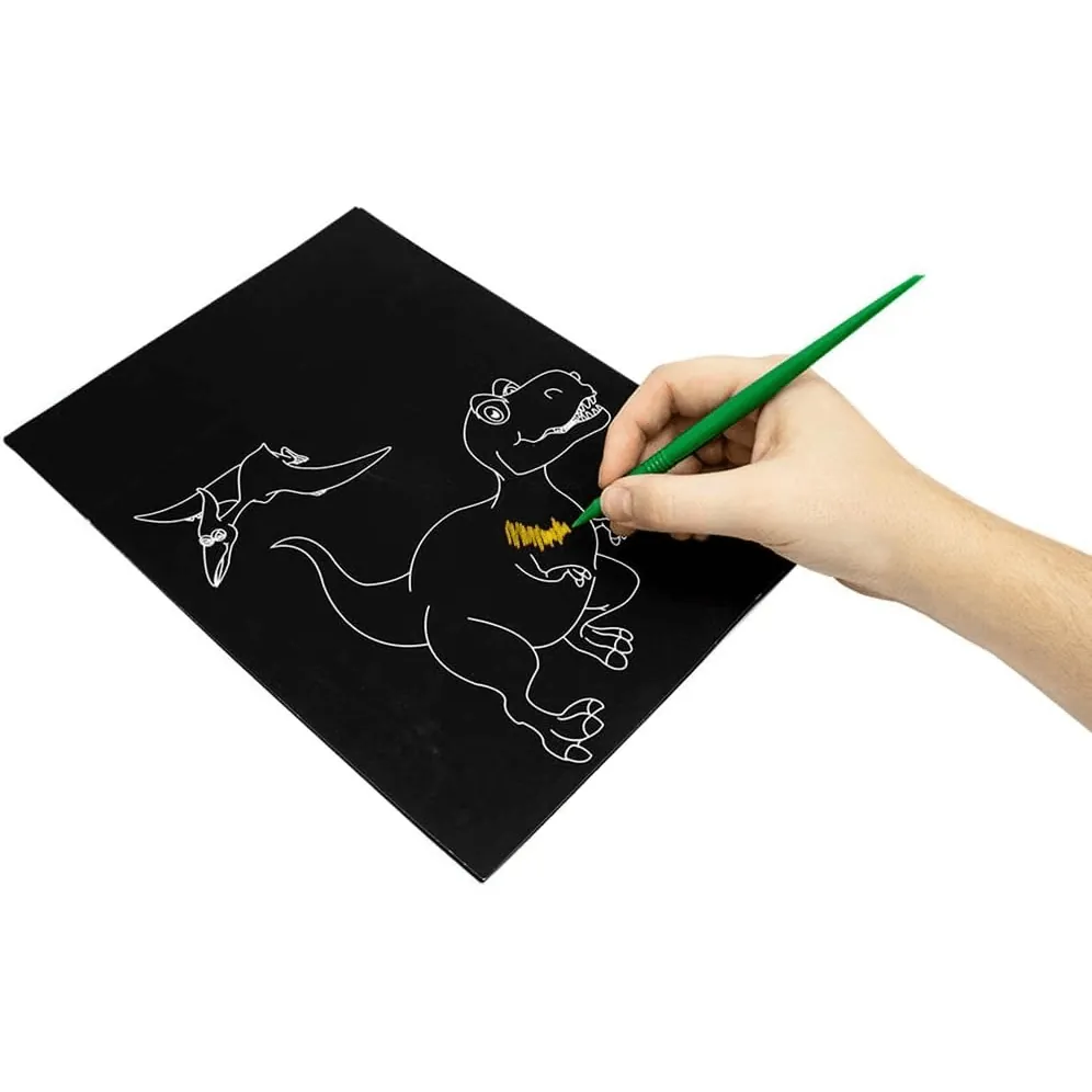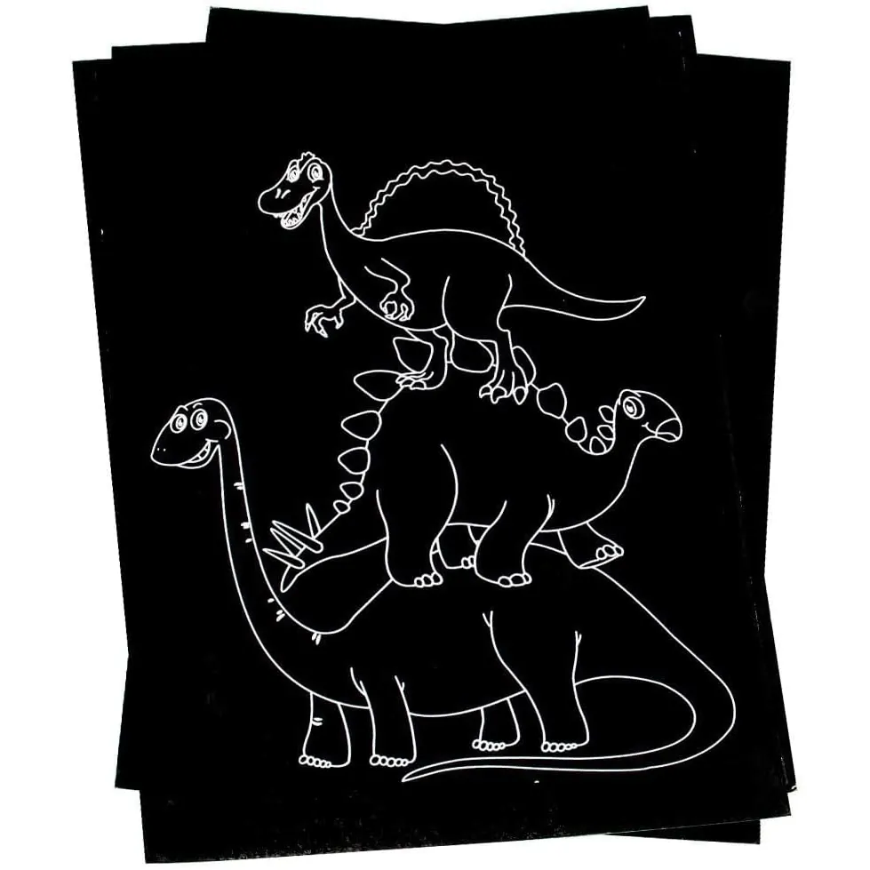 Papel colorido revestido por uma camada preta. Permite que você desenhe com o bastão, já incluído no produto, arranhando a superfície e fazendo com que a criatividade apareça no papel.