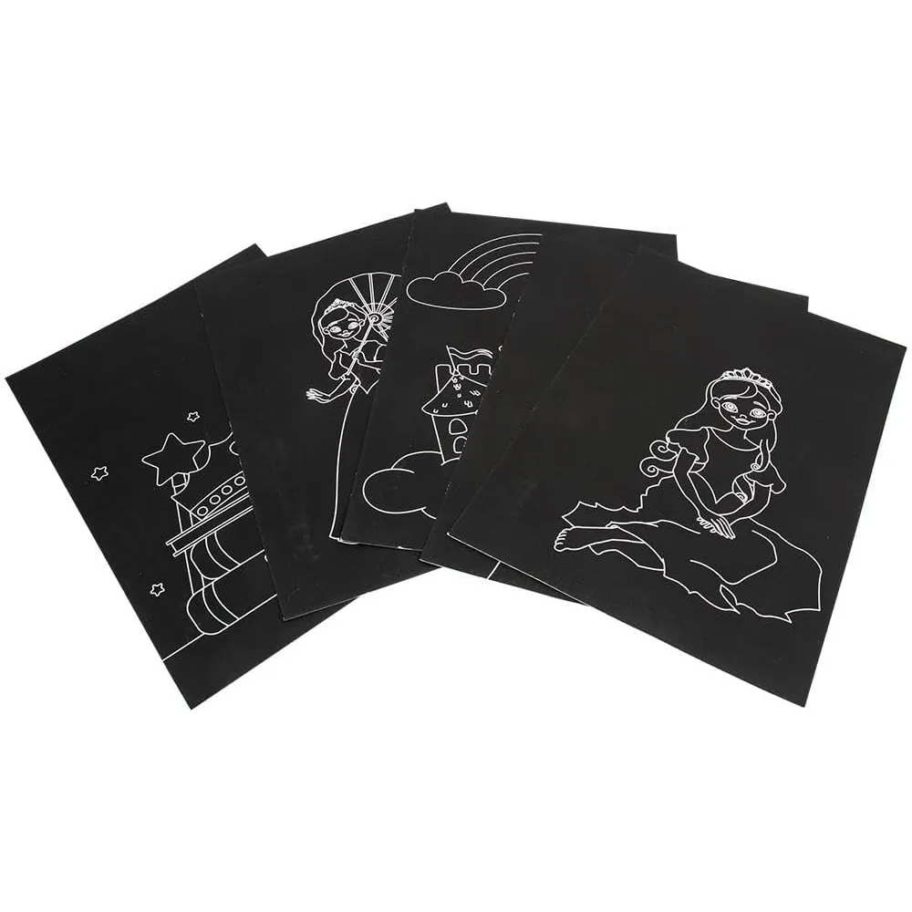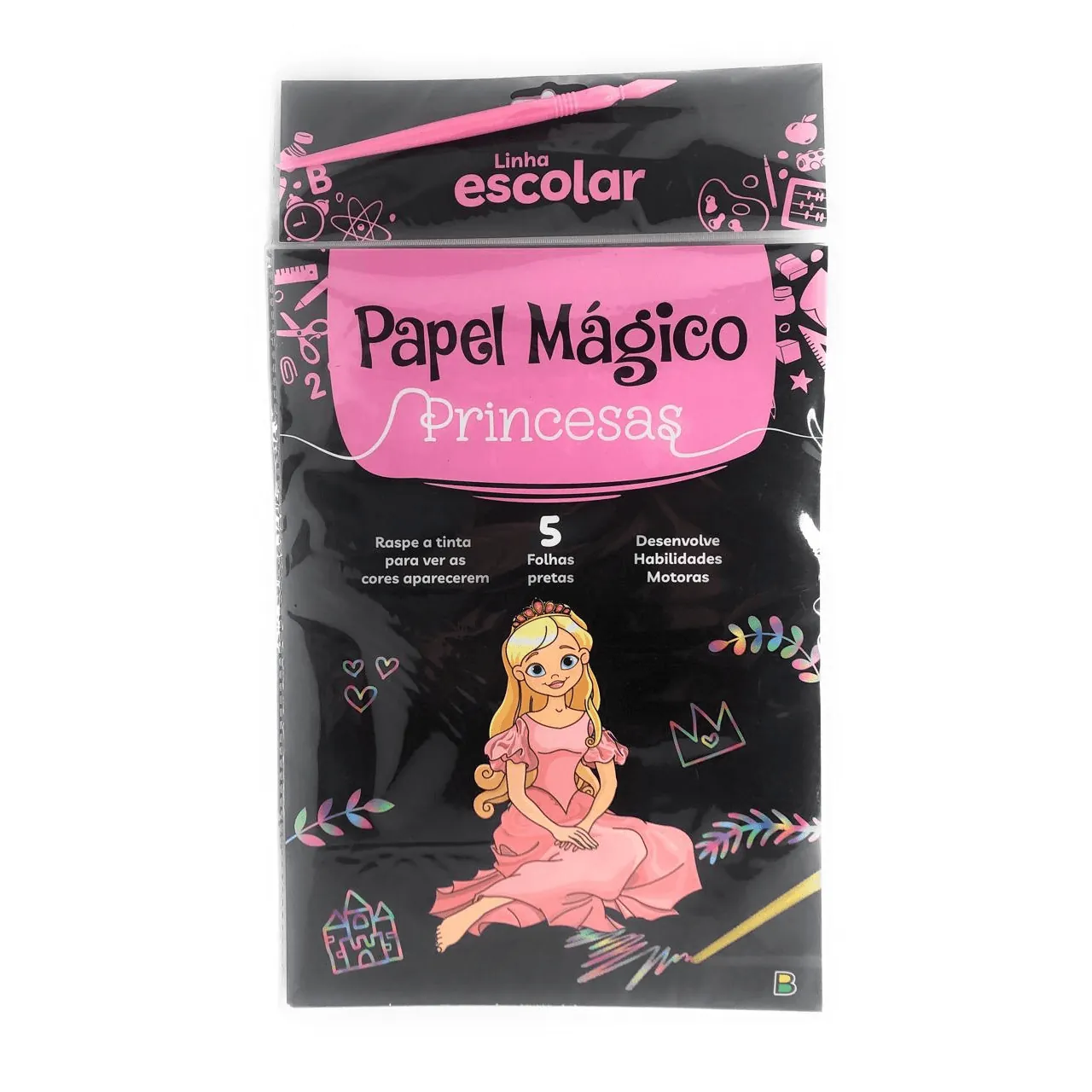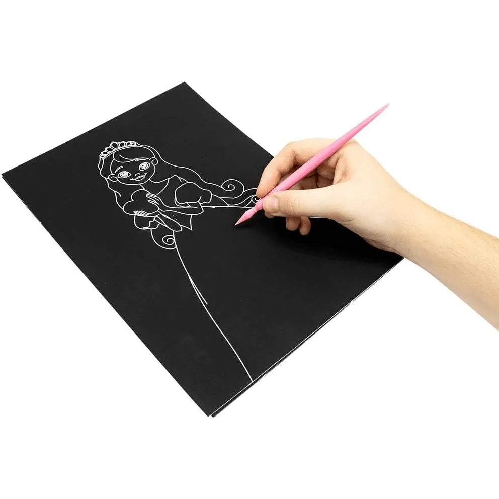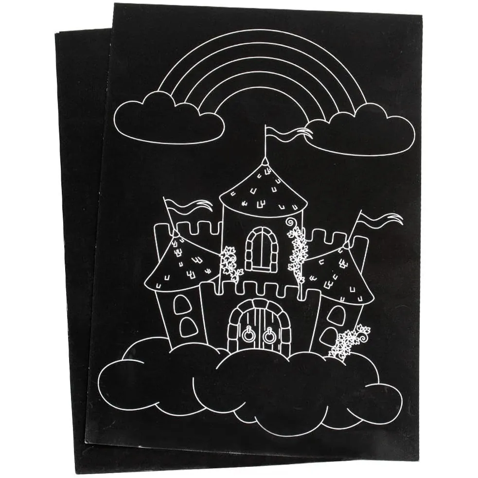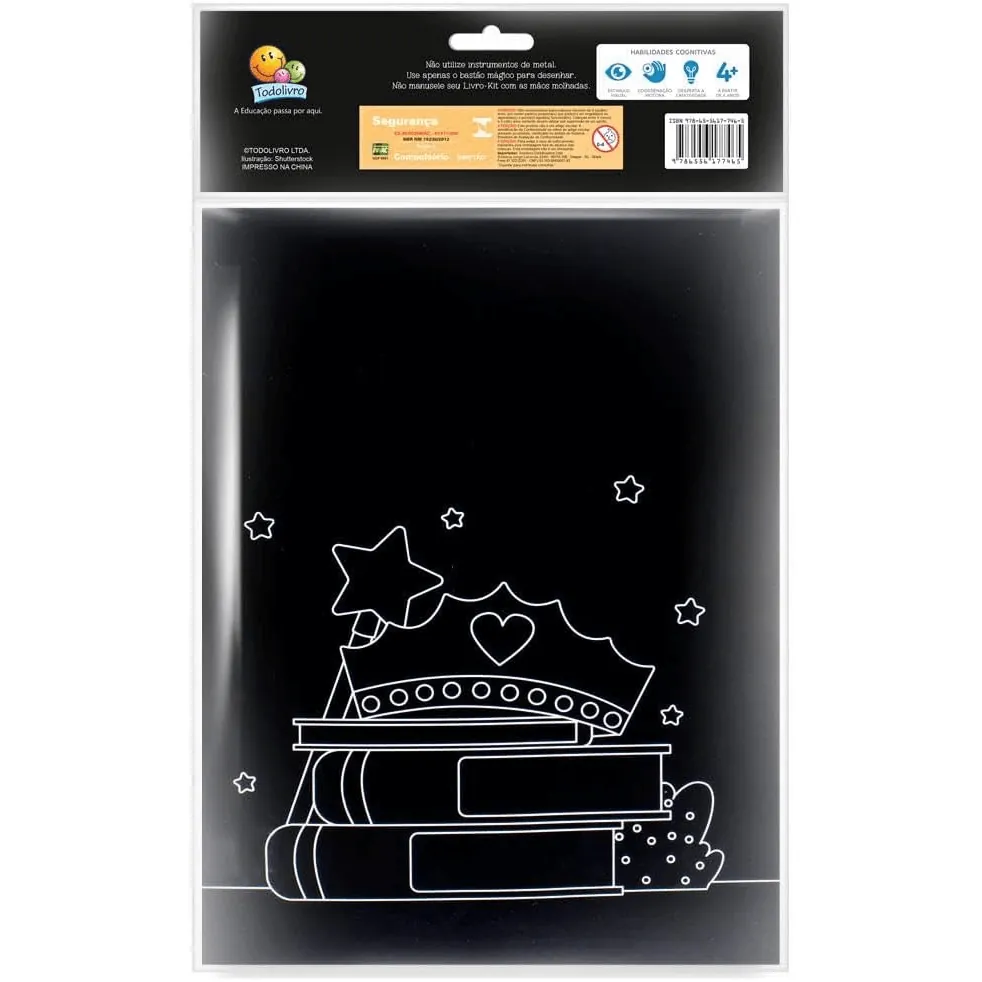 Papel colorido revestido por uma camada preta. Permite que você desenhe com o bastão, já incluído no produto, arranhando a superfície e fazendo com que a criatividade apareça no papel.