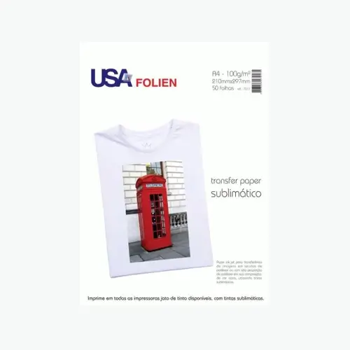 Papel Inkjet para transferência de imagens em tecidos de poliéster ou com alta proporção de poliéster em sua composição, de cor clara, utilizando tintas sublimáticas.