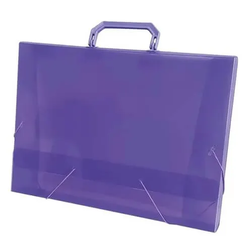 Maleta em polipropileno, com design exclusivo ACP. Tamanho 360mm X 260mm X 43mm. Possui abas com encaixe para canetas e régua geométrica. Lombo 43mm. Ideal para uso escolar e apresentação de trabalhos de grande formato.