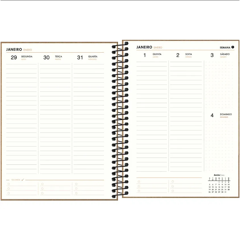 – Com capa dura e folhas com visões anual, mensal e semanal.