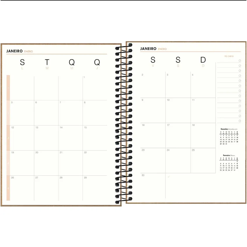 – Com capa dura e folhas com visões anual, mensal e semanal.